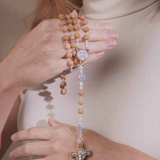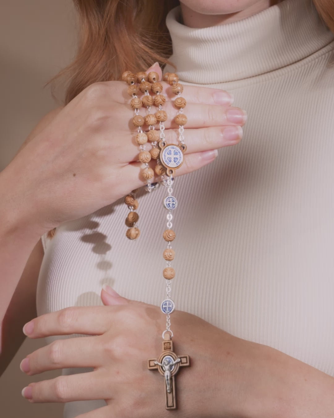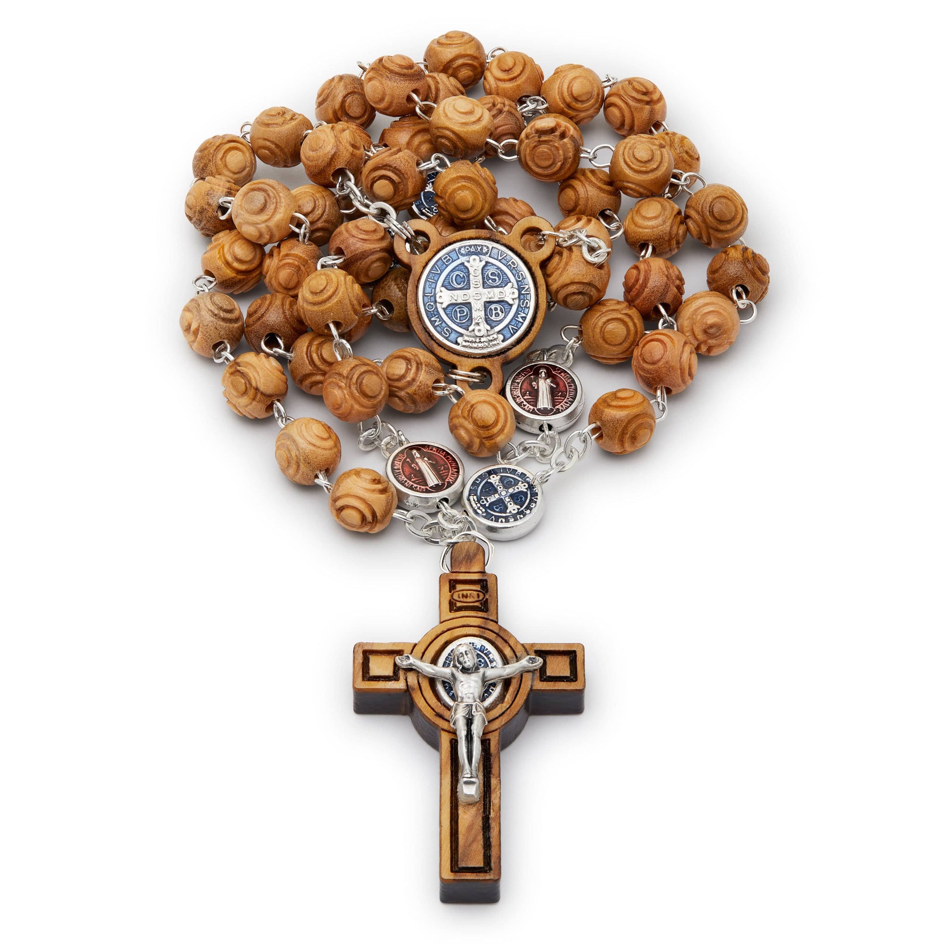Rosario de Madera de Olivo con Medalla de San Benito Esmaltada como Pieza Central