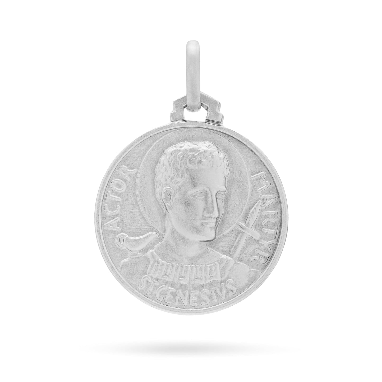 Medalla redonda de plata de ley 925 que representa al Santo Patrón de los actores: San Ginés. El Santo fue un actor y comediante que inicialmente se burló de los cristianos a través de sus obras y entendiendo de la persecución de Diocleciano, decidió realizar una obra de teatro con la intención de burlarse de los Cristianos. Por esto eligió inscribirse como catecúmeno para aprender todo sobre el cristianismo. La historia cuenta que durante la representación teatral, un actor parodio el Bautismo sobre Ginés y al momento de parodiar el acto se sucedió un milagro. Ginés se convirtió al Cristianísimo.