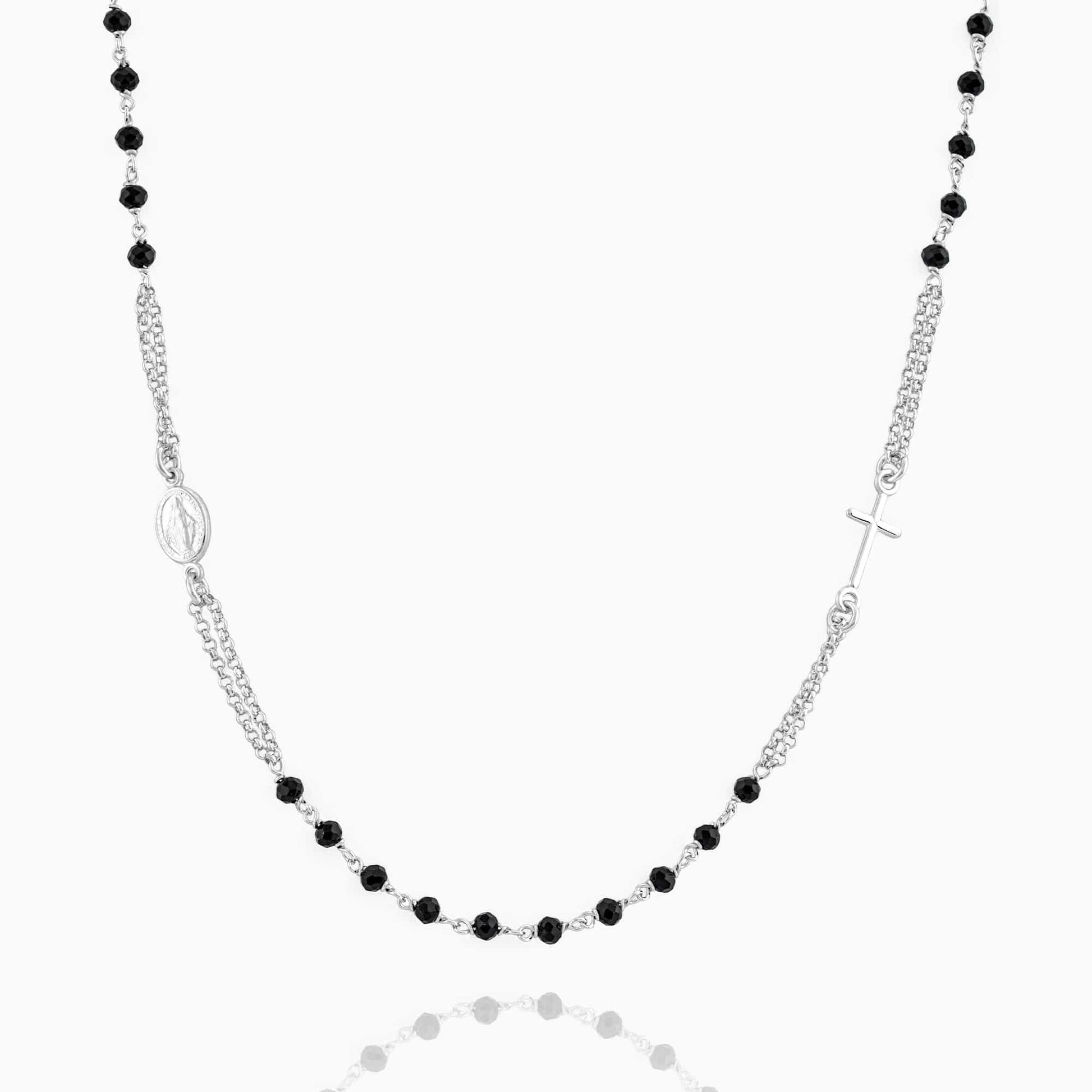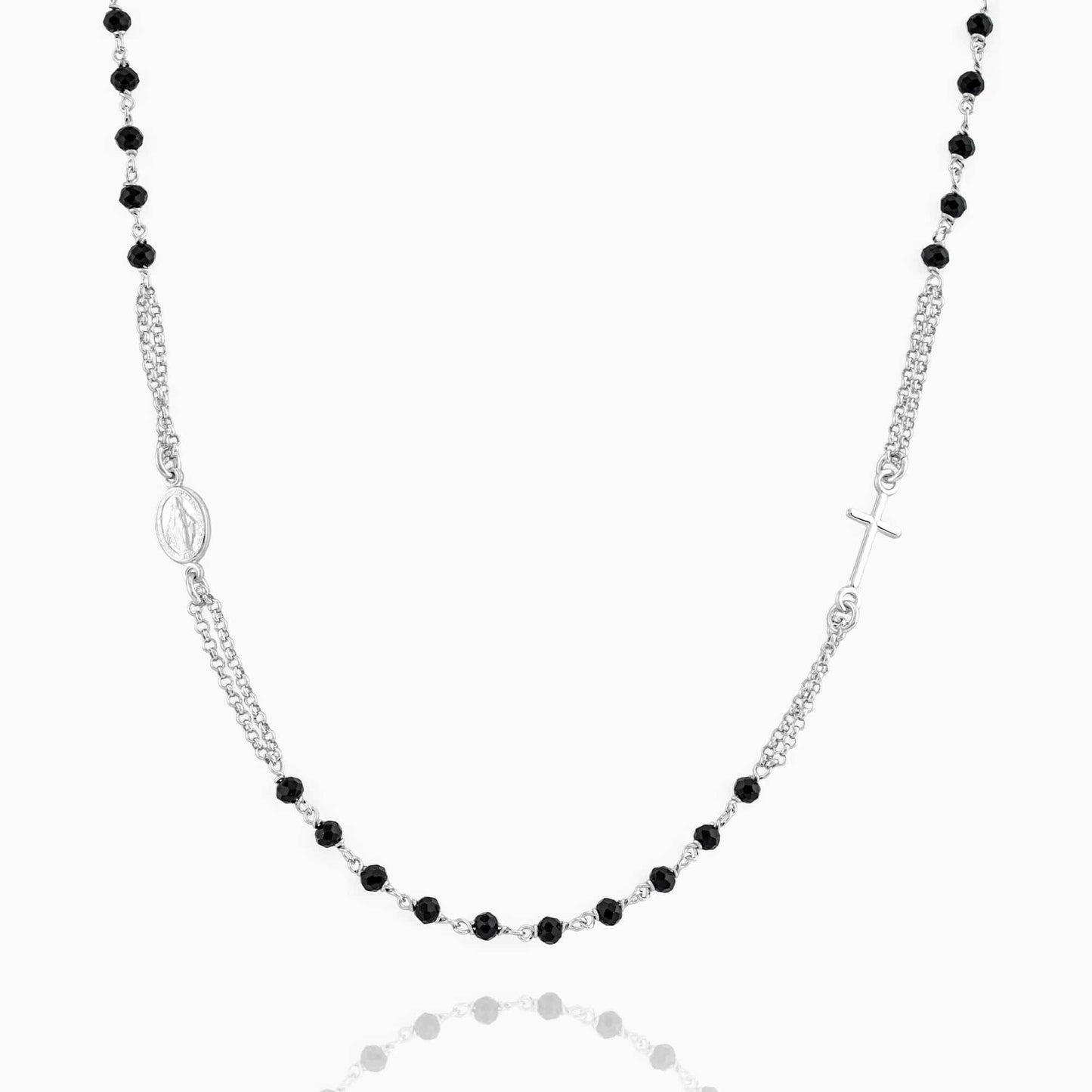 Collar fabricado en Plata 925 con Preciosas cuentas en Vidrio Perlado y Cristales Blancos. El collar presenta una medalla de la Virgen Milagrosa y una simple Cruz sin Cuerpo.