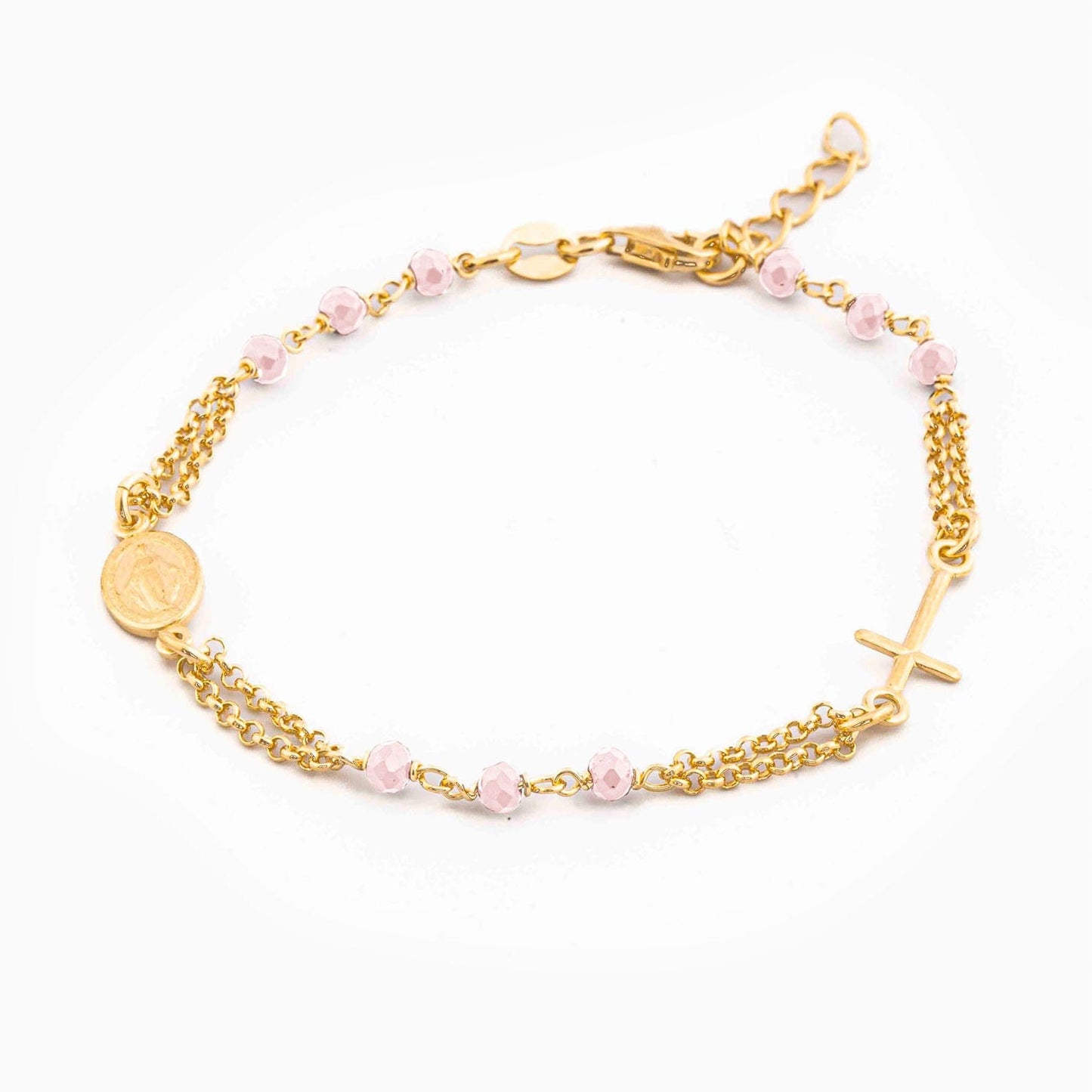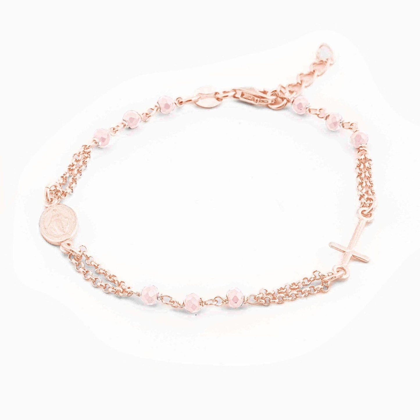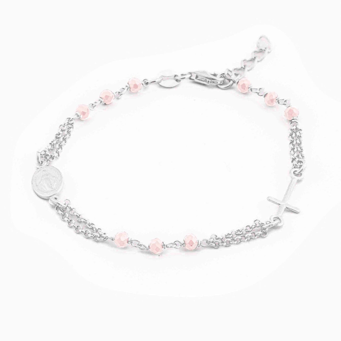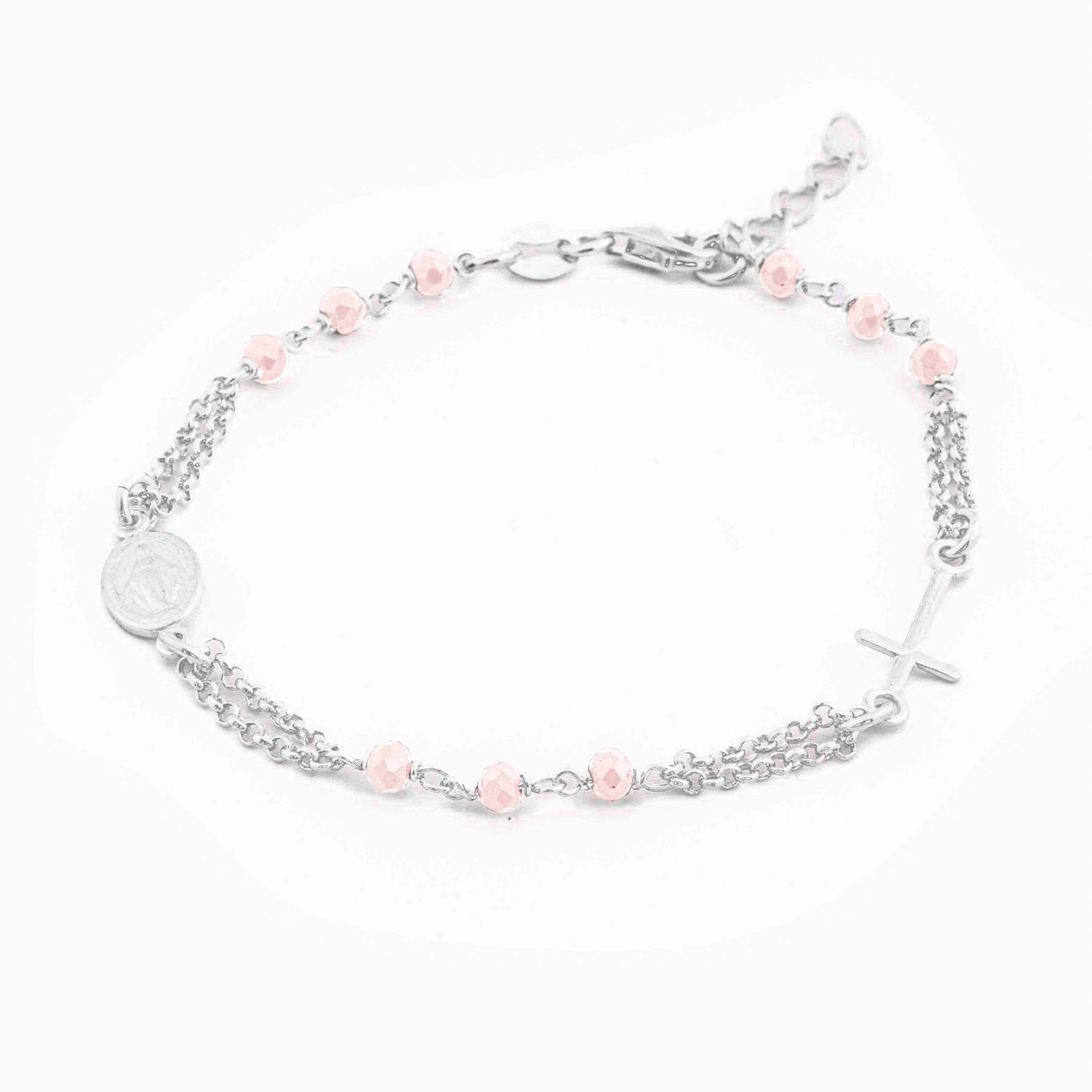 ROSARIO PULSERA DE PLATA CON CADENA DOBLE Y CUENTAS FACETADAS ROSA