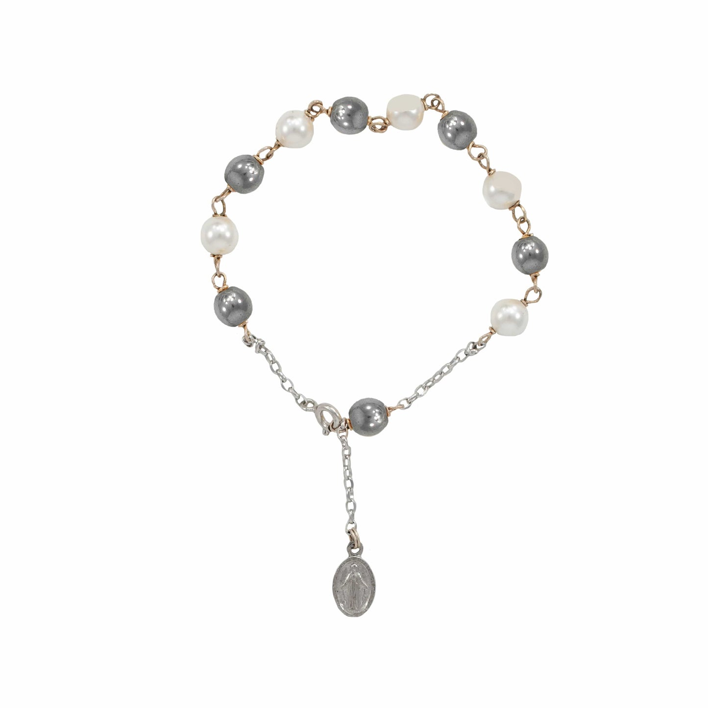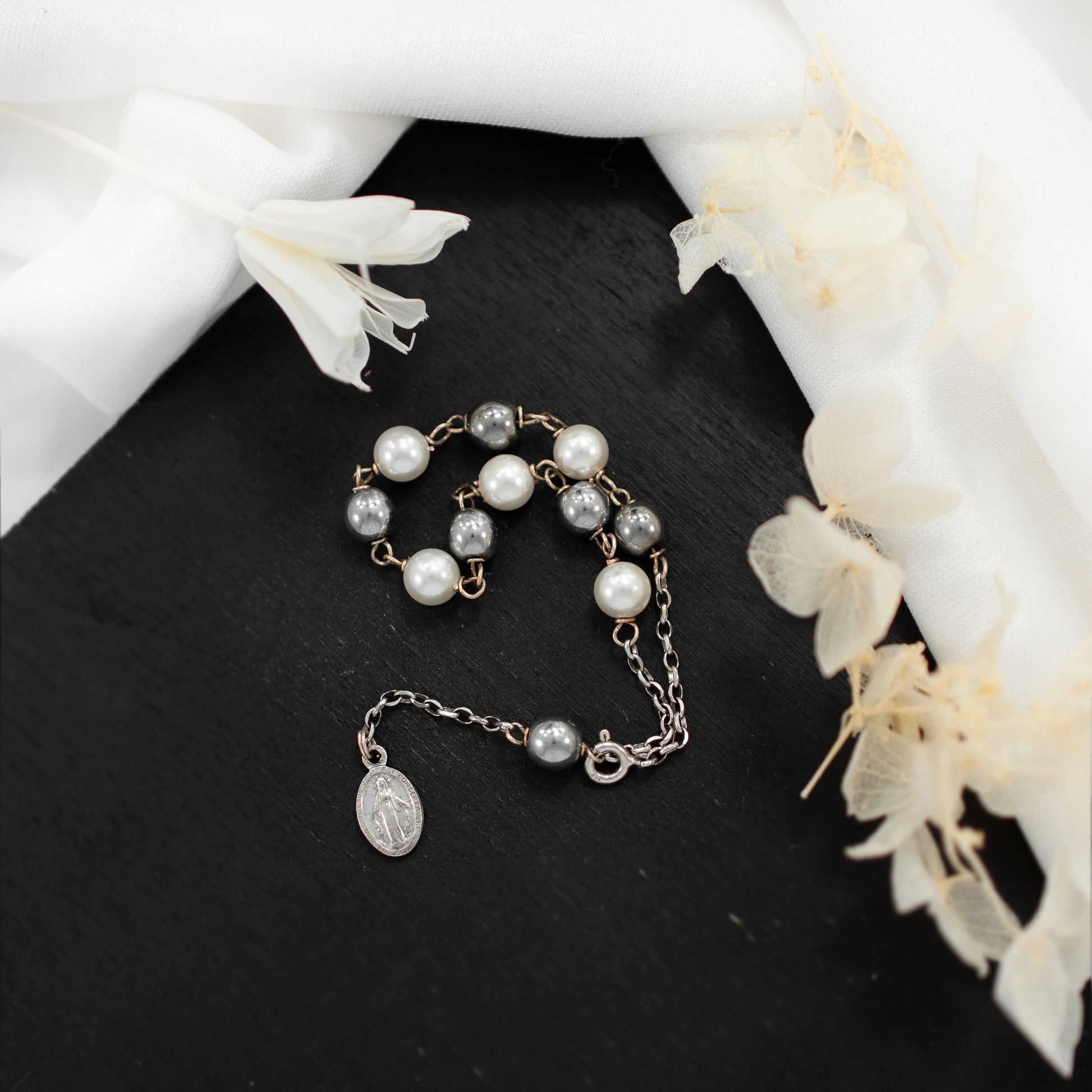 Rosario pulsera tradicional elaborado en Plata 925 con Perlas Swarovski Blancas y Hematita. Nuestro precioso Rosario presenta la Medalla Milagrosa egualmente en Plata.