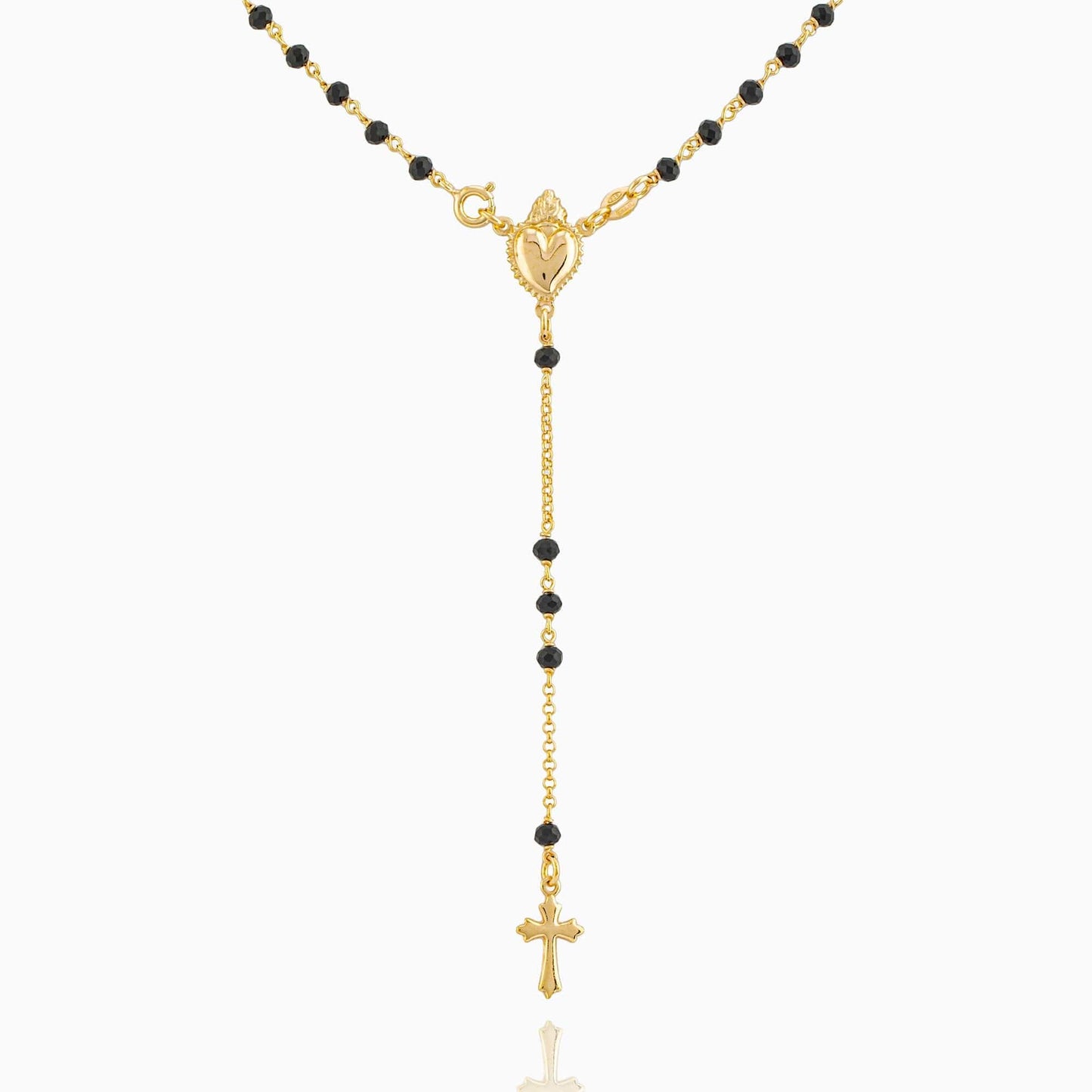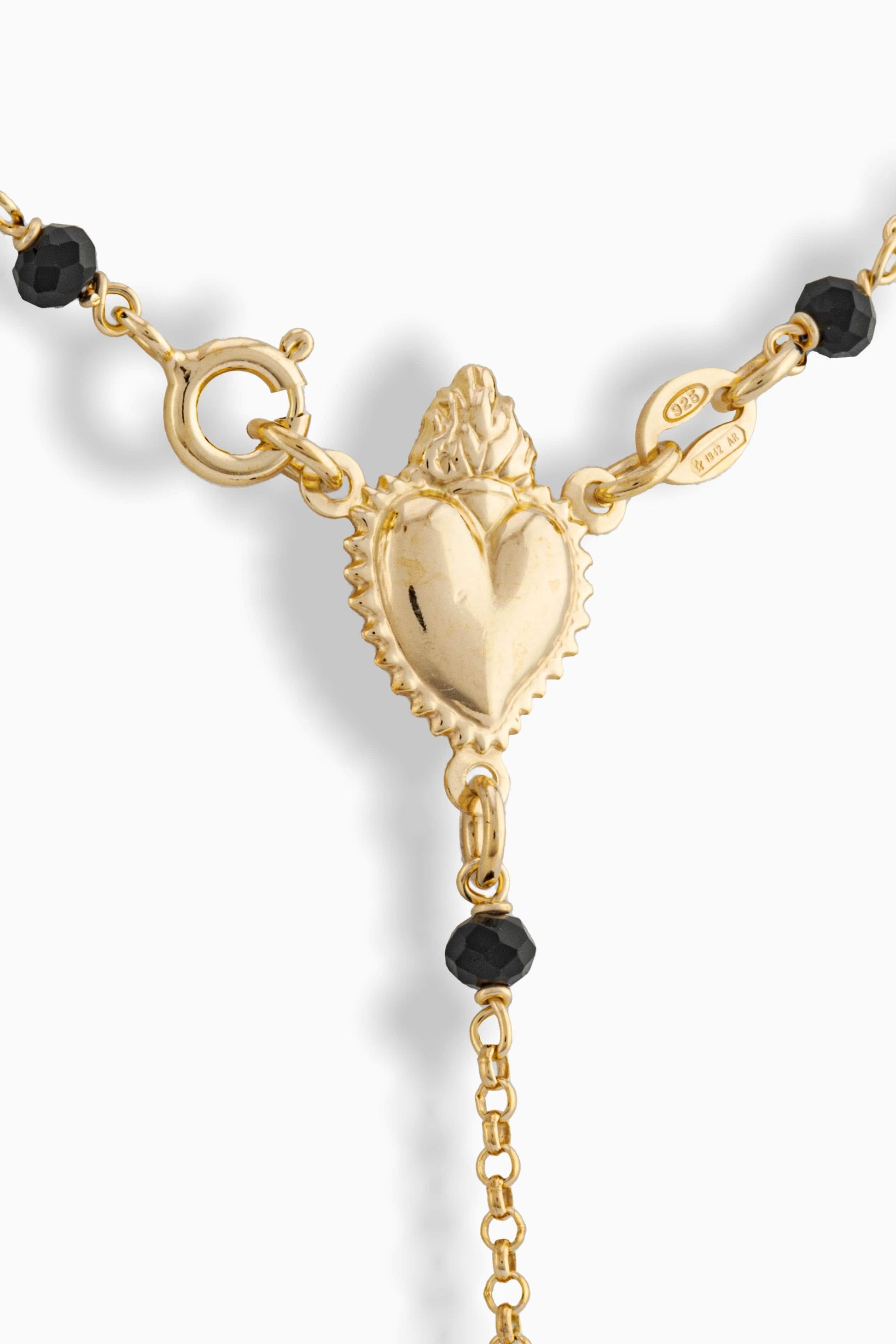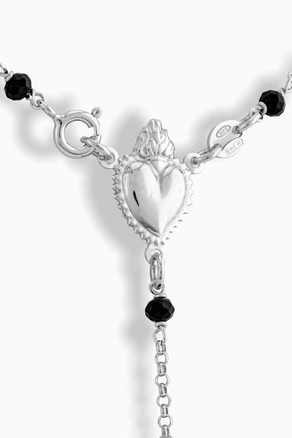 Rosario bañado en plata 925 con cuentas negras, medalla del Sagrado Corazón. Una tierna pieza hecha a mano.