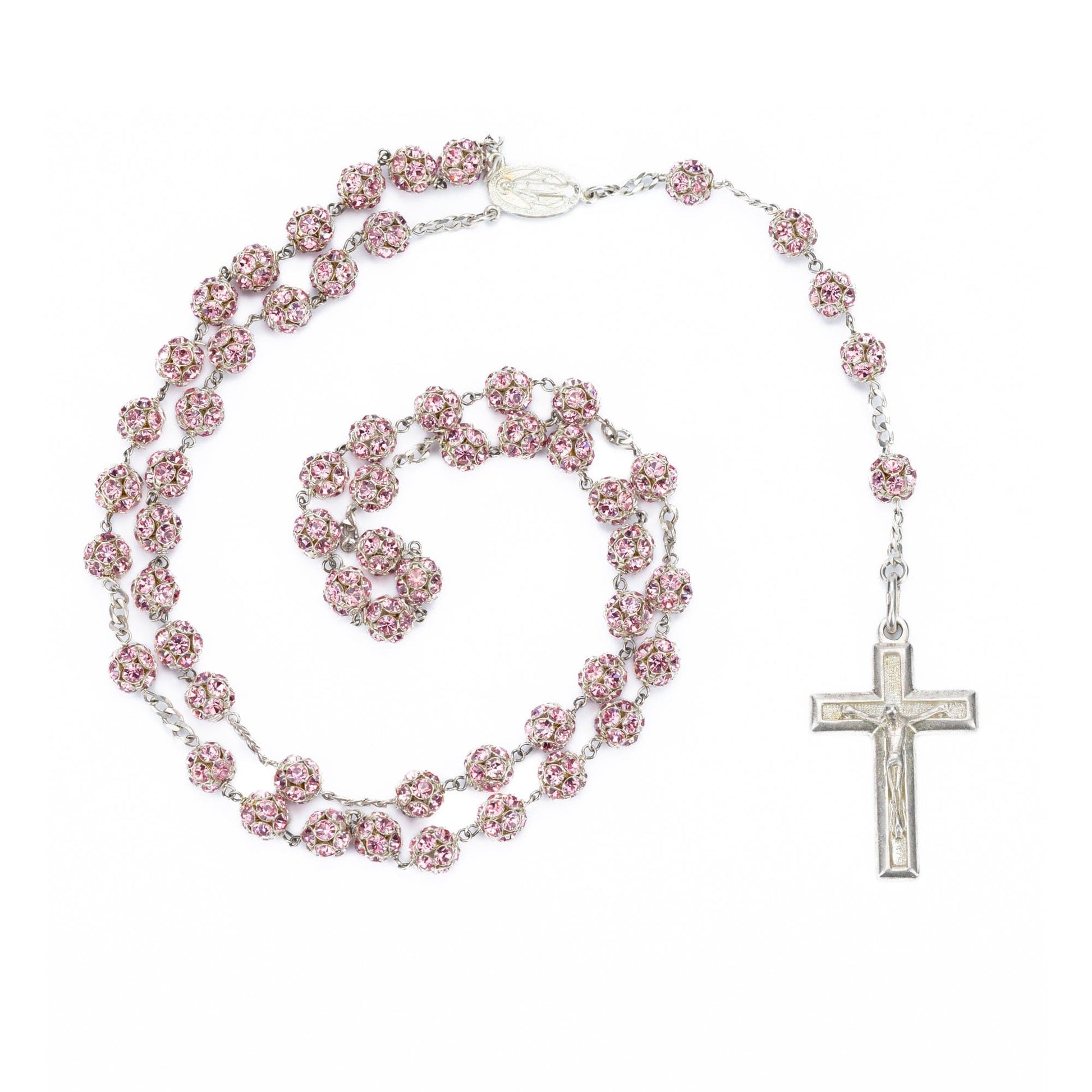 Elegante rosario de plata adornado con brillantes cuentas rosadas de strass que reflejan ternura, amor y serenidad interior. En el centro brilla la Medalla Milagrosa de la Virgen, símbolo de gracia, protección y compasión divina. Un rosario refinado y lleno de significado, ideal como regalo espiritual o como símbolo de una fe delicada para atesorar.
