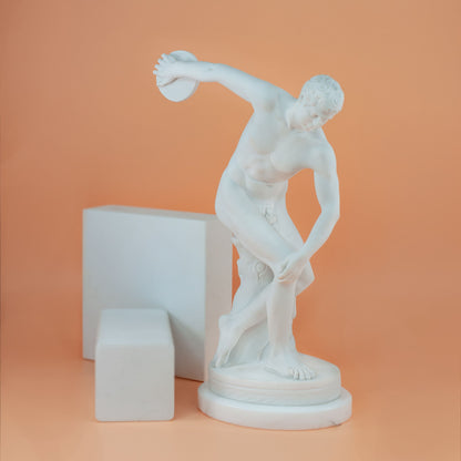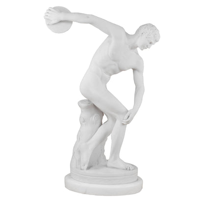 Reproducción fiel del 'Discobolus' de Mirone hecho íntegramente de Polvo de Mármol. El Discobolus es sin duda una de las esculturas más famosas de la antigüedad. Fue realizada por el gran artista entre los años 455 y 450 aC La estatua, como su nombre indica, representa a un atleta mostrado en el acto de lanzar el disco, durante una competición deportiva. La pose del Discobolus parece tan suelta, natural y convincente que la escultura ha sido considerada como una de las representaciones de movimiento más animadas propuestas por un escultor clásico.