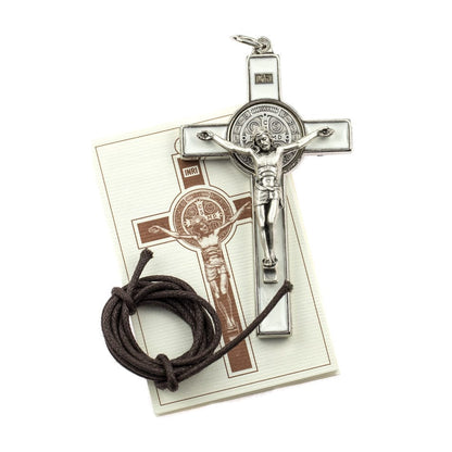 Cruz de San Benito en esmalte blanco, cajita de plastico, explicacaion de lla Cruz del Santo.