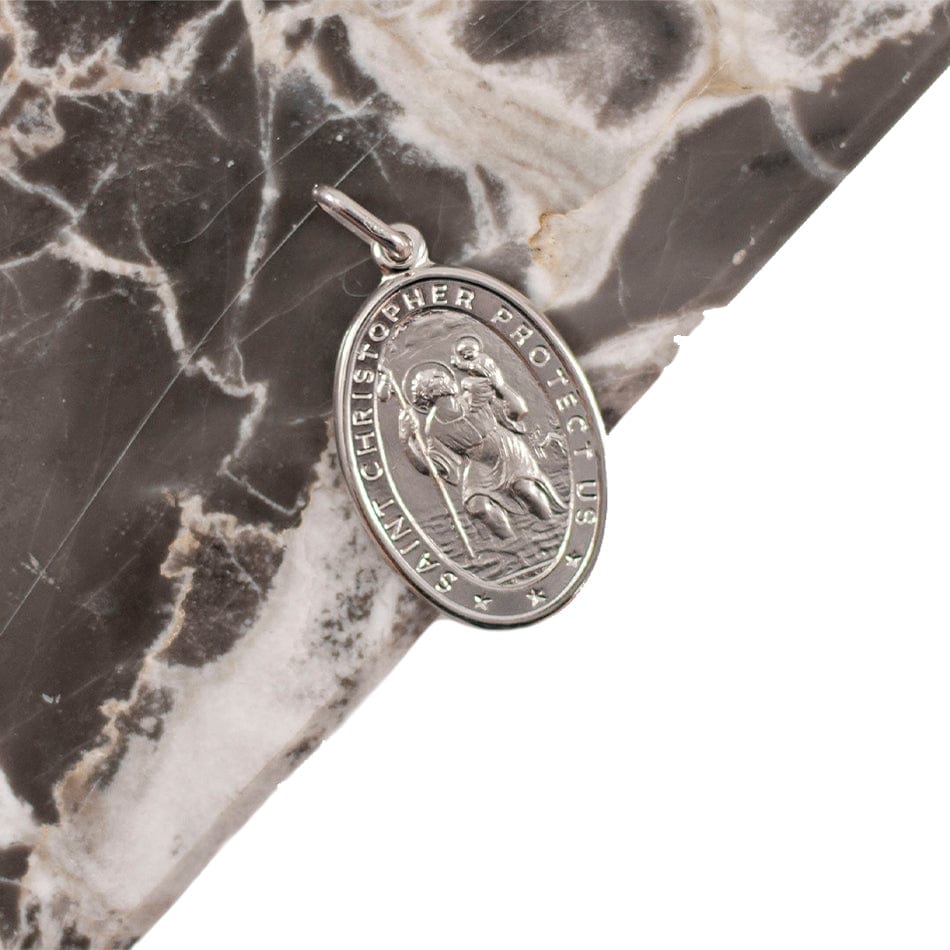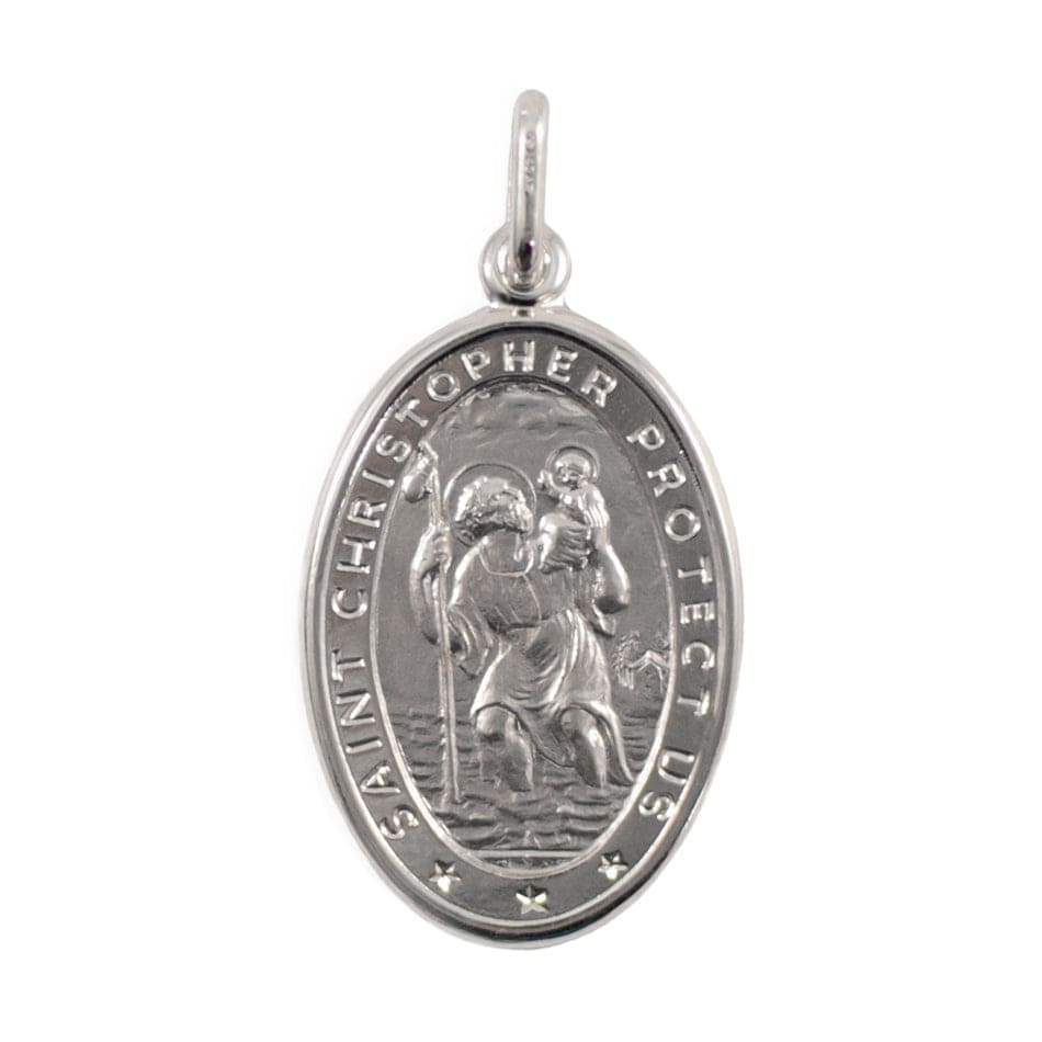 La medalla de San Cristóbal representa el Santo eremita que, gracias a su enorme estatura, ayudaba a los peregrinos a cruzar los ríos turbulentos. Es venerado como uno de los 14 Santos auxiliadores y lleva el NiÑo Jesús en sus hombros.