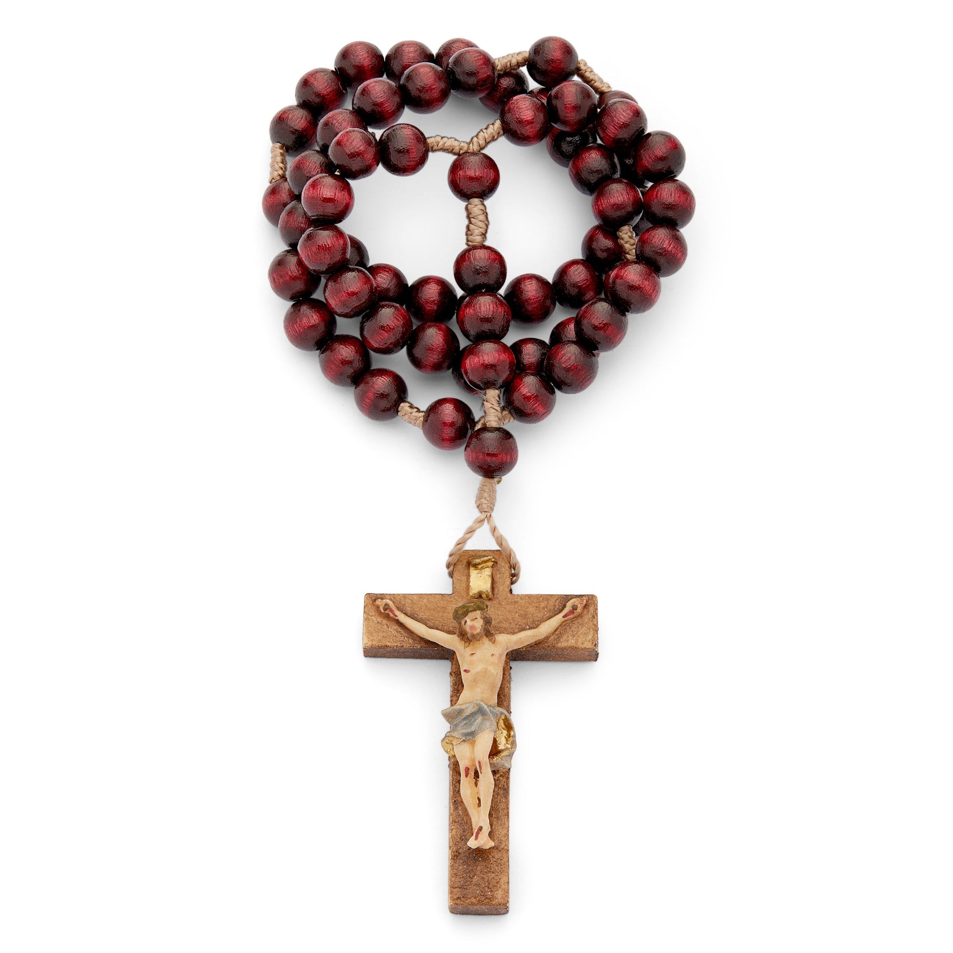 Rosario con cuentas de madera en forma redonda, crucifijo de madera tallada en color.