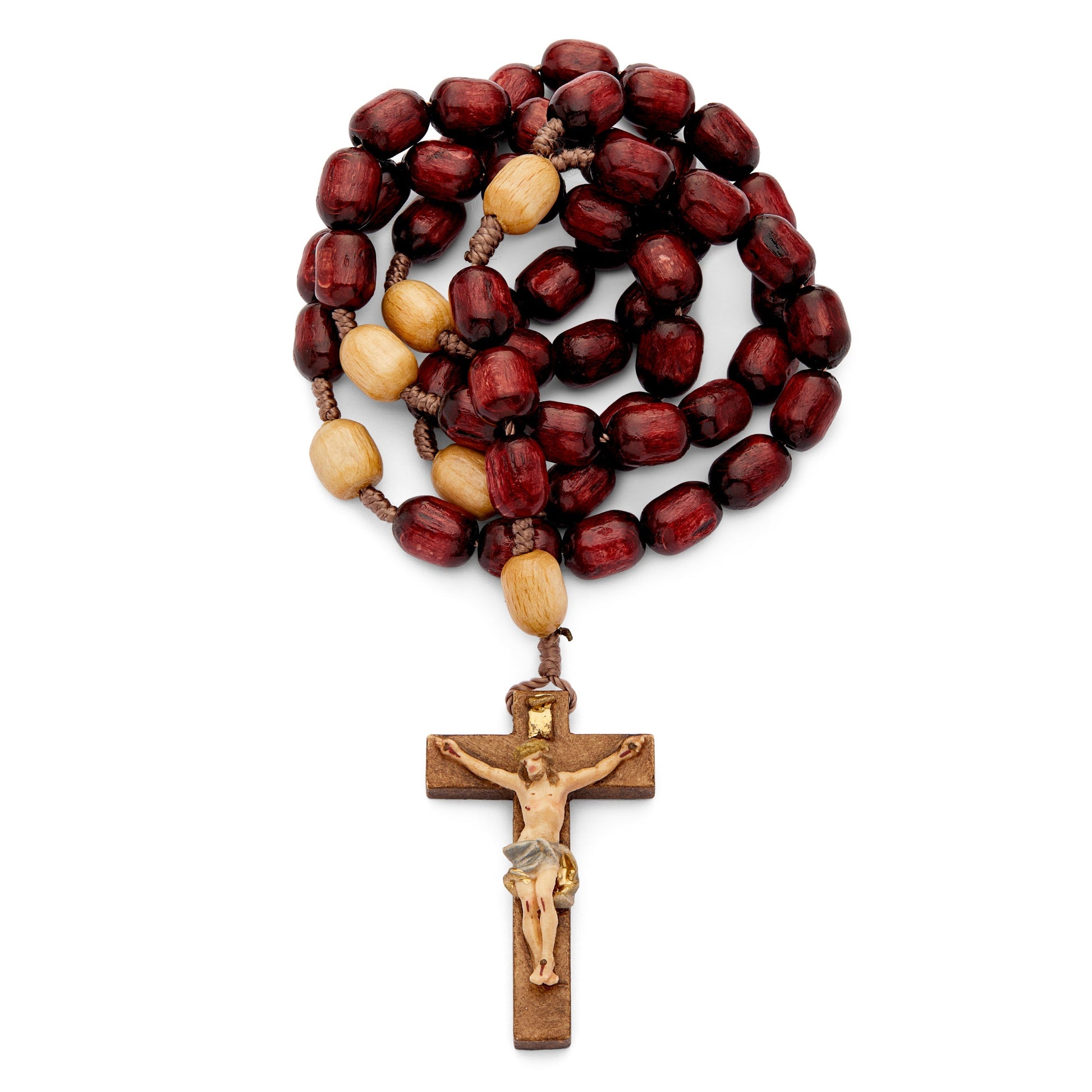 Rosario artesanal de madera color caoba, elaborado con cuentas ovaladas lisas y agradables al tacto. El cordón de unión garantiza resistencia y flexibilidad, ideal para el uso diario o la oración personal. Al final del rosario se encuentra un crucifijo de madera finamente tallado y pintado a mano, con el Cuerpo de Cristo esculpido con gran atención al detalle. Un verdadero objeto de fe, perfecto como regalo religioso, recuerdo de peregrinación o símbolo de devoción para llevar siempre contigo. Une tradición, belleza y espiritualidad en un solo gesto.