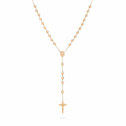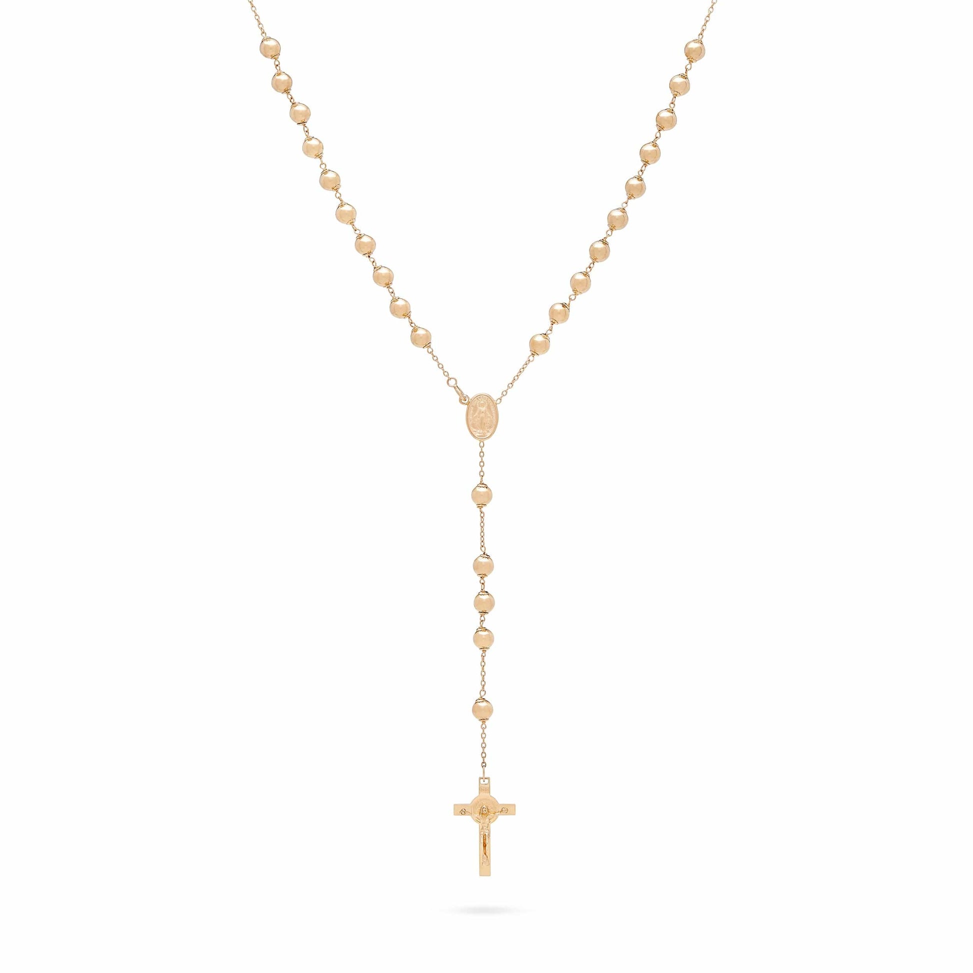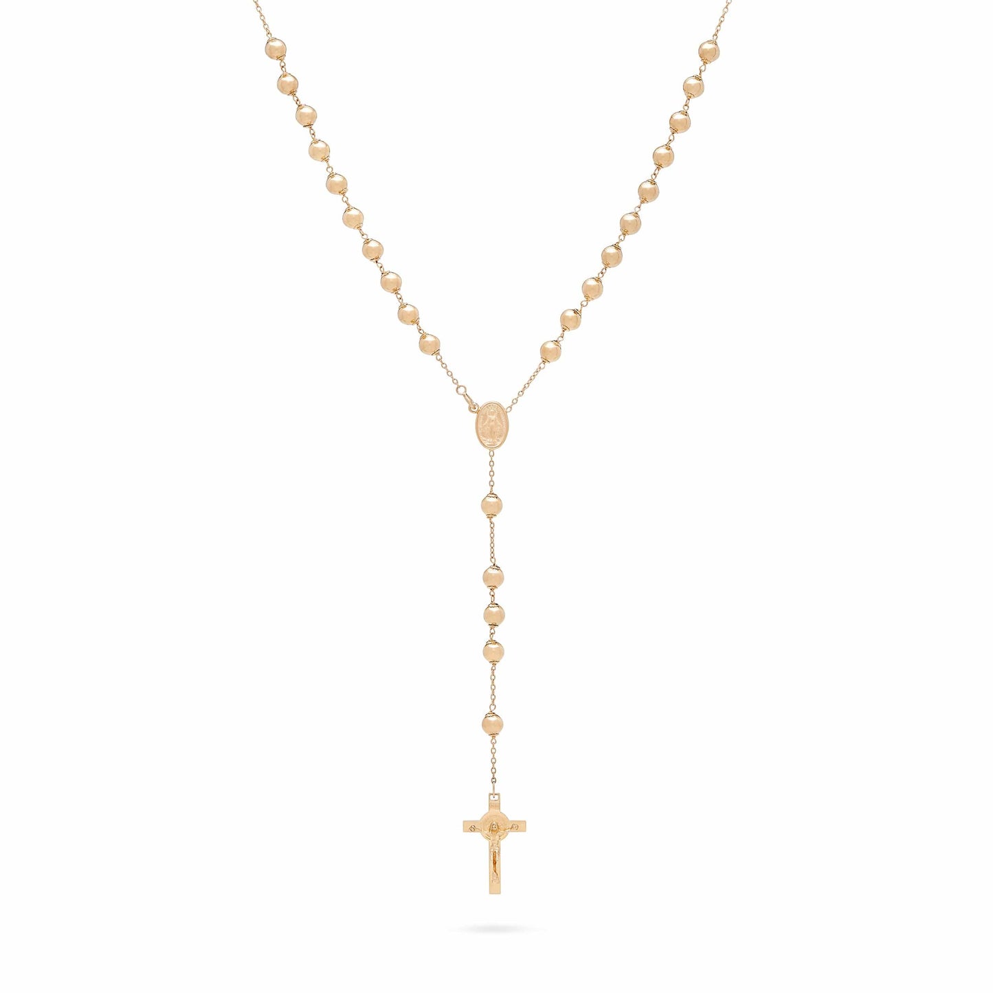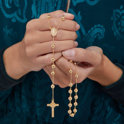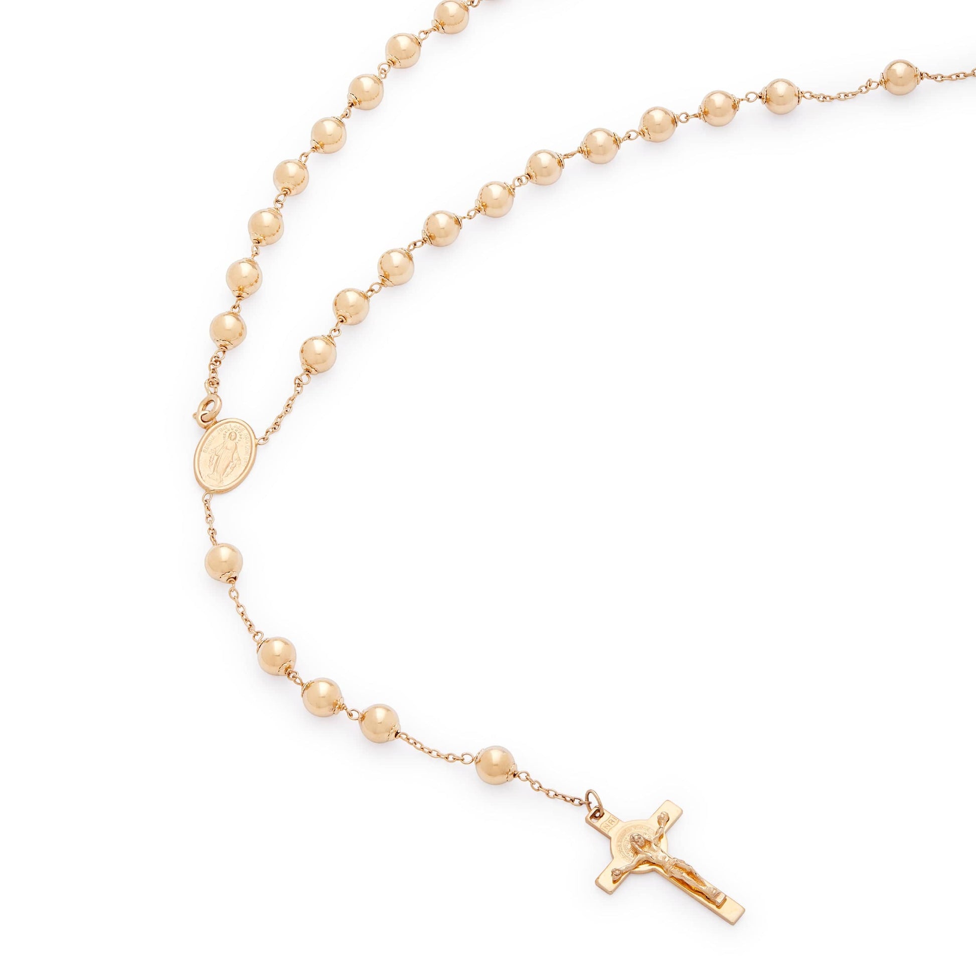 Rosario en oro amarillo de 18 quilates con cuentas de 5 milímetros. Medalla con la imagen de María Milagrosa y el crucifijo de San Benito al final del rosario.