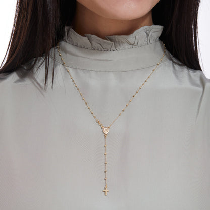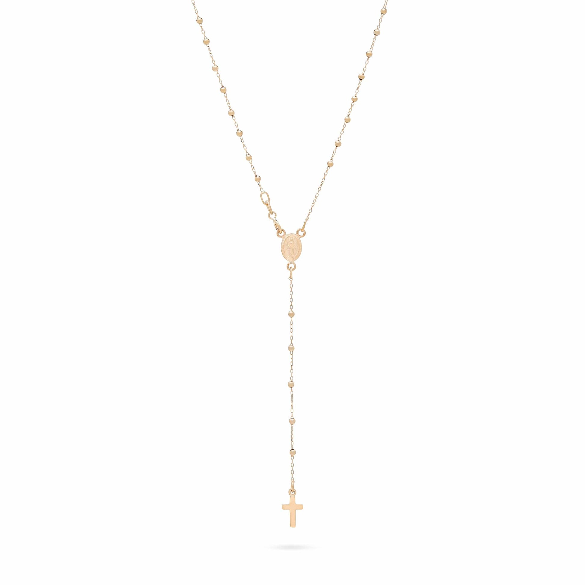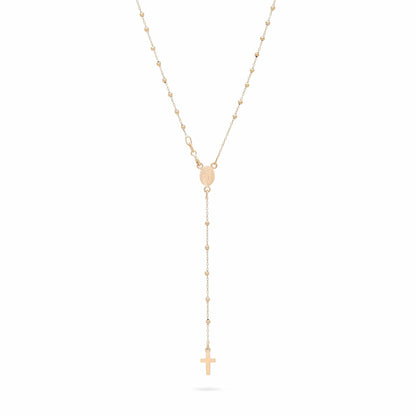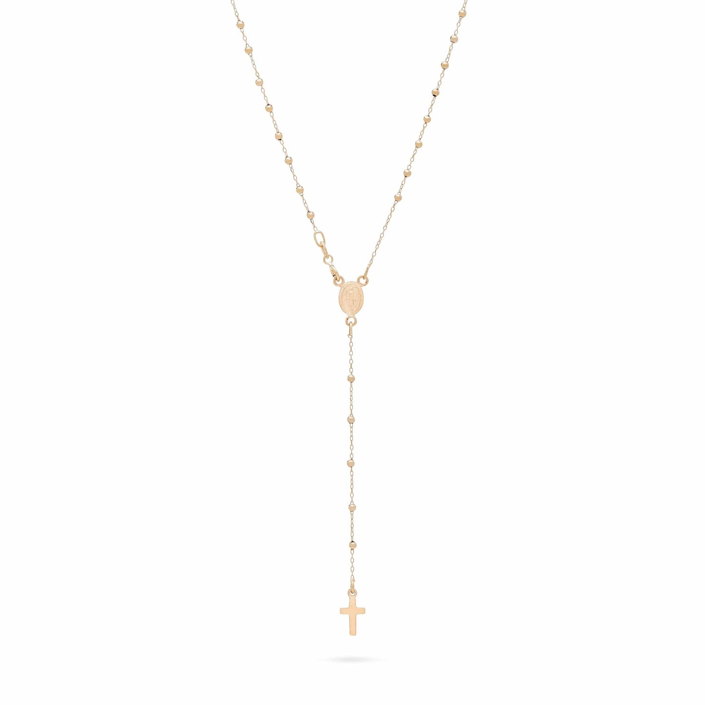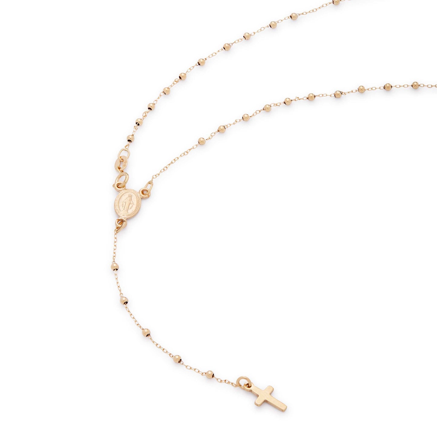 El Rosario está enteramente elaborado a mano por nuestros artesanos en Oro Amarillo 18kt. Presenta la Medalla de la Virgen Milagrosa y una Cruz simple sin Cuerpo. Bolas redondas de 1mm, cierre con mosquetón.