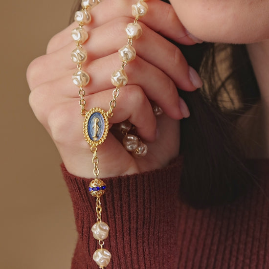 Ce chapelet de dévotion est confectionné en métal doré et orné de perles synthétiques lumineuses, ainsi que de délicats détails bleus sur le crucifix et les perles d'espacement. La pièce centrale représente Notre-Dame de la Médaille Miraculeuse, Marie debout sur le globe terrestre, les rayons jaillissant de ses mains, symbole de grâce et de protection pour la prière quotidienne. Le crucifix en émail bleu, portant l'inscription INRI, crée un contraste saisissant avec la finition dorée, rendant ce chapelet catholique à la fois élégant et durable, idéal comme cadeau précieux ou pour une dévotion personnelle.