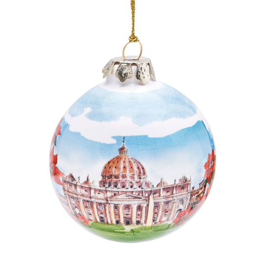 Palla Di Natale in Ceramica Rappresentante Basilica Di San Pietro E Colosseo Con Fiori Rossi