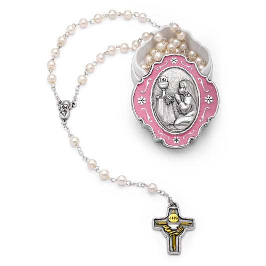 Portarosario Smaltato Rosa Della Prima Comunione Con Rosario Con Grani in Perla