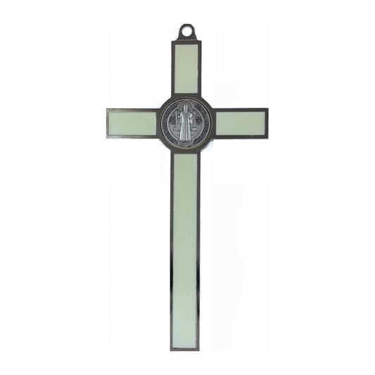 Crocifisso Di San Benedetto in Metallo Smaltato Bianco Con Decorazioni