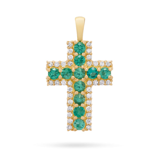 Croce Pendente in Oro Giallo con Smeraldi Centrali e Diamanti