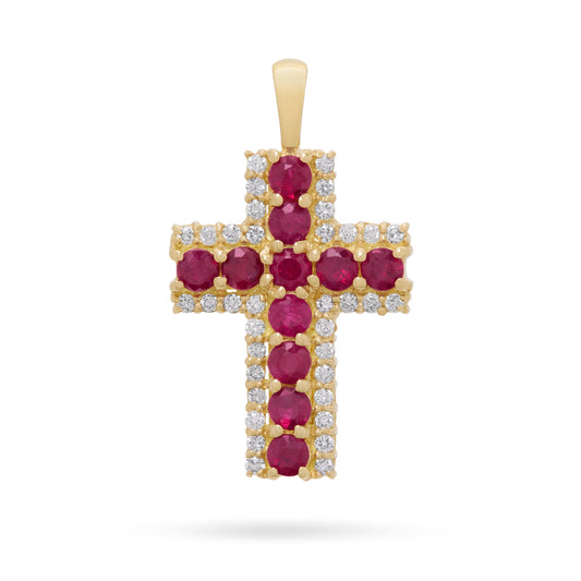 Croce Pendente in Oro Giallo con Rubini Centrali e Diamanti