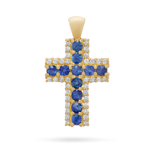 Croce Pendente in Oro Giallo con Zaffiri Centrali e Diamanti