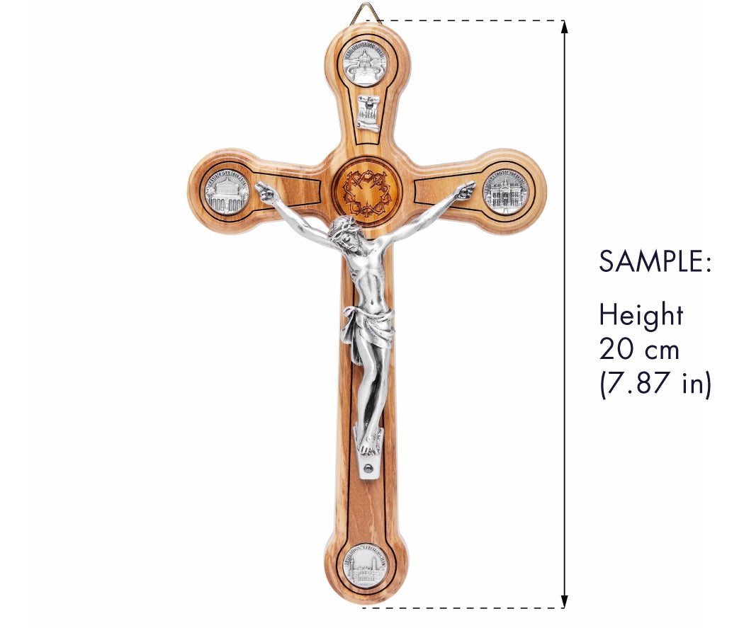 Per misurare i nostri Crocifissi, prendiamo in considerazione il punto più alto e quello più basso del braccio verticale, senza considerare il gancio posto in alto per appenderlo.