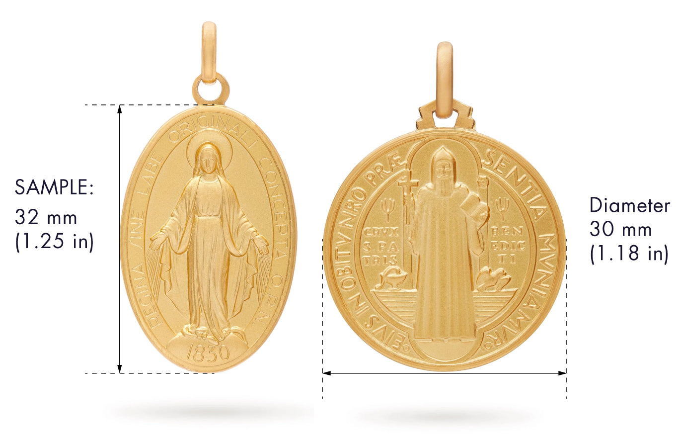 Quando misuriamo una delle nostre medaglie, teniamo sempre conto del punto più alto e più basso della medaglia di forma ovale e del diametro per le medaglie di forma rotonda, senza considerare il gancio.