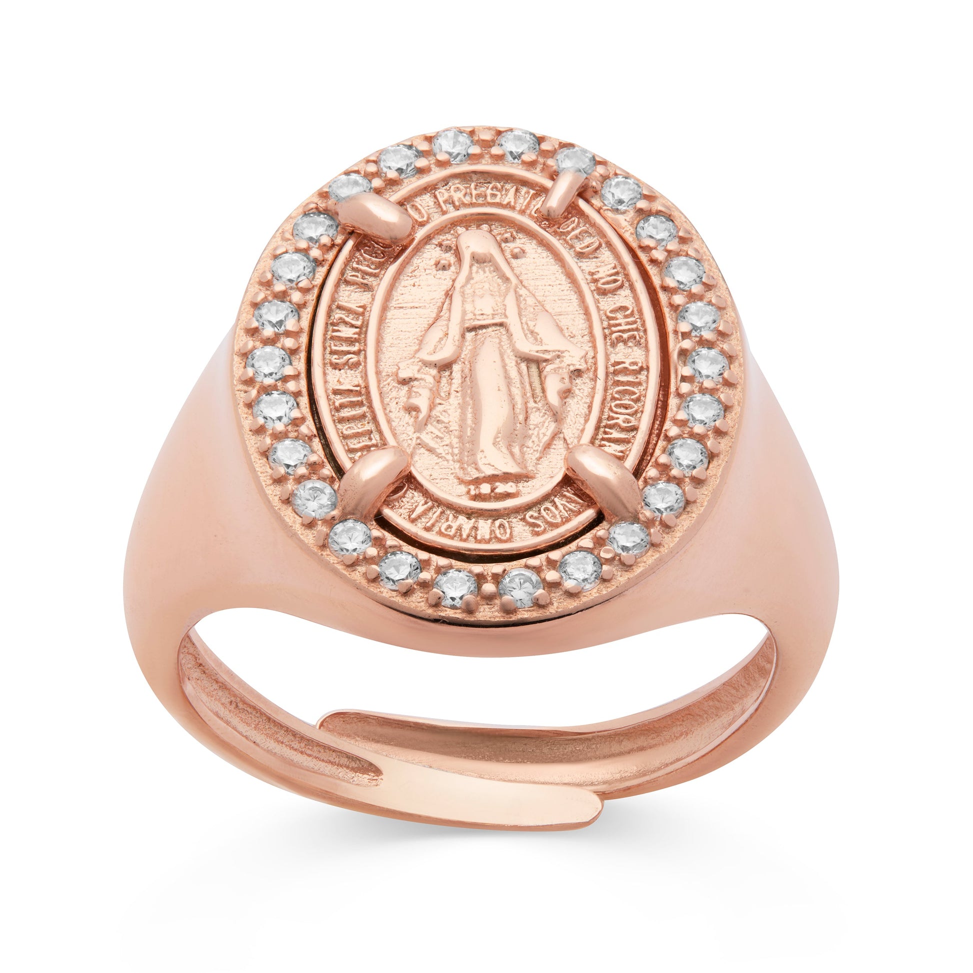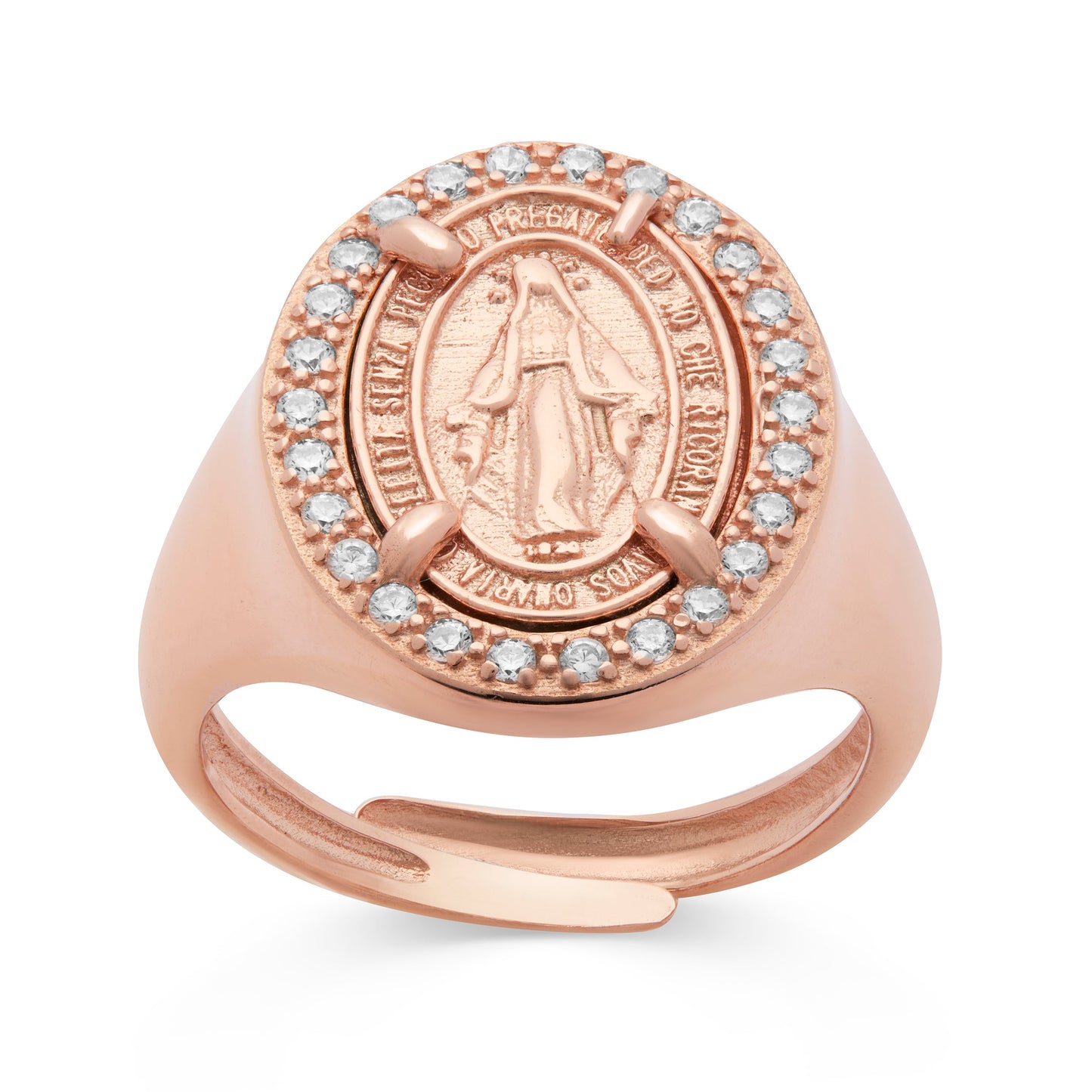 Anello Chevalier Regolabile in Argento Placcato Oro Rosa Con Medaglia Miracolosa E Zirconi