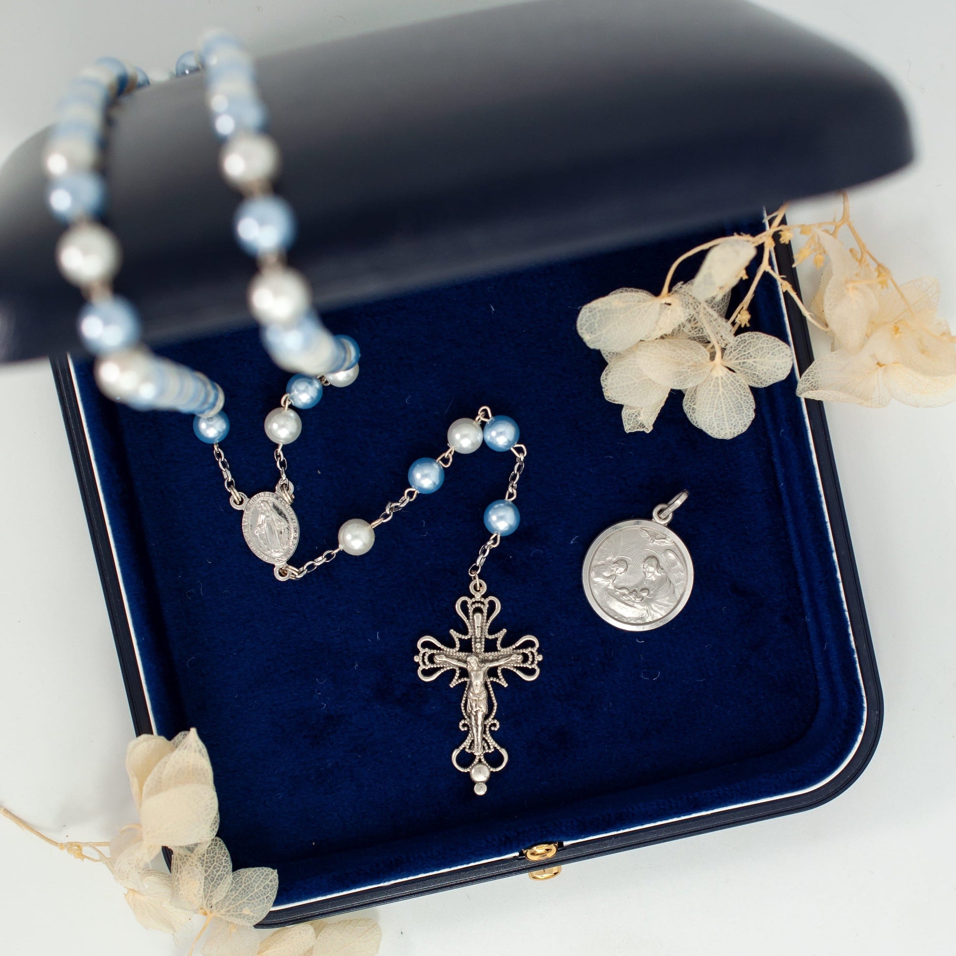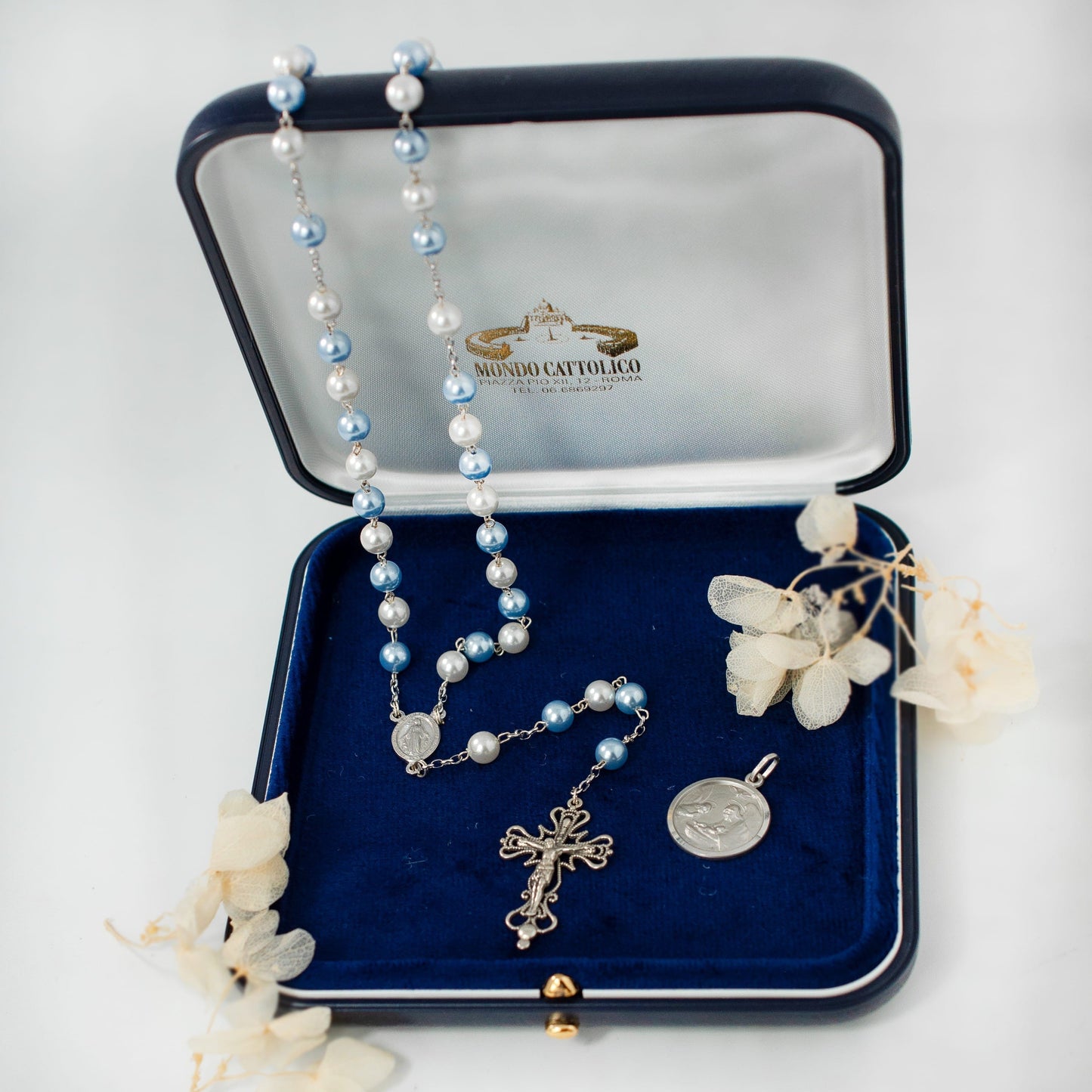 Set regalo in Argento 925 certificato per celebrare il Battesimo. Il set comprende: una collana rosario in Argento 925 con Grani da 6mm in Perla Swarowki bianchi e celesti; una medaglia finemente lavorata a mano raffigurante il Sacramento del Battesimo. Il set è confezionato in una grande scatola Blu.