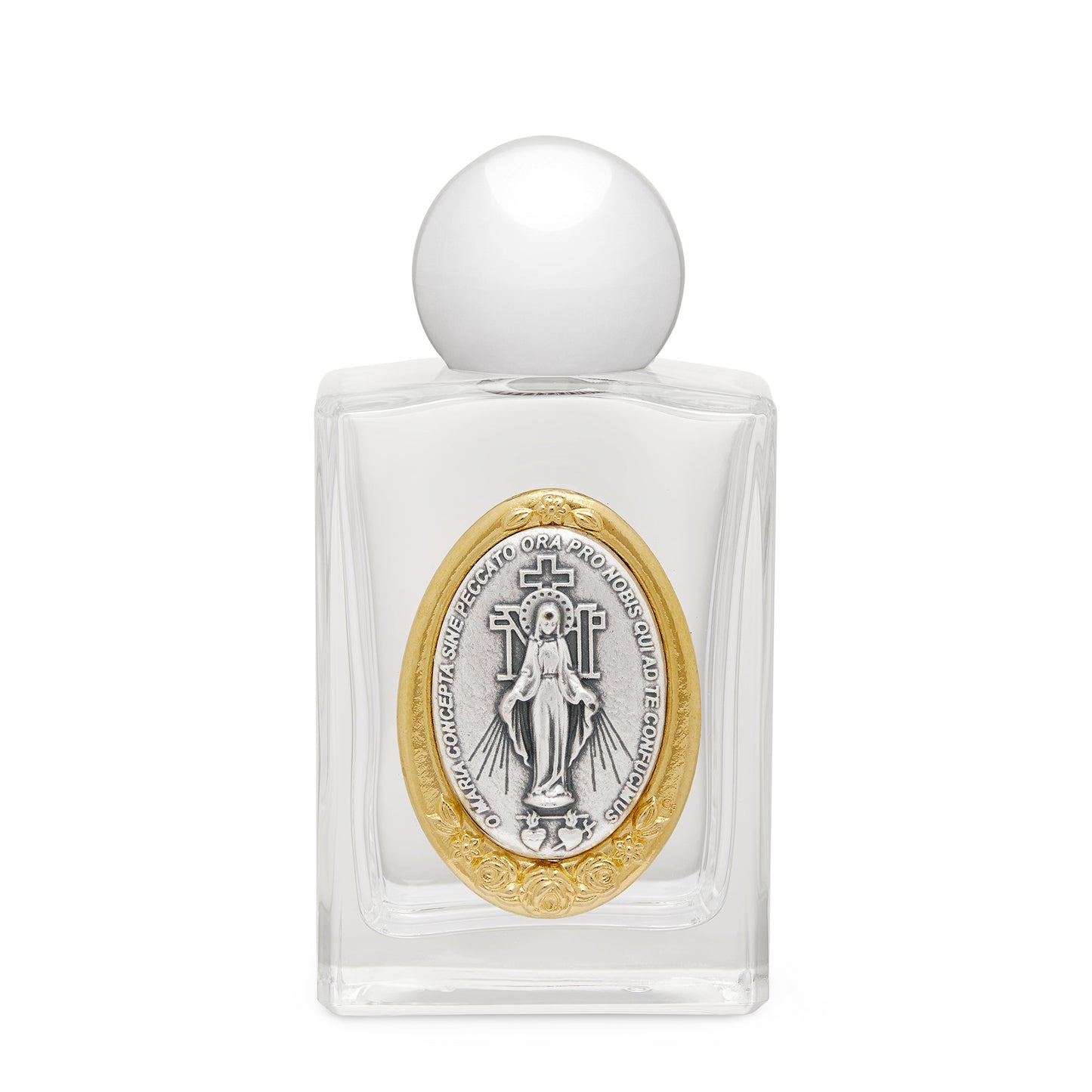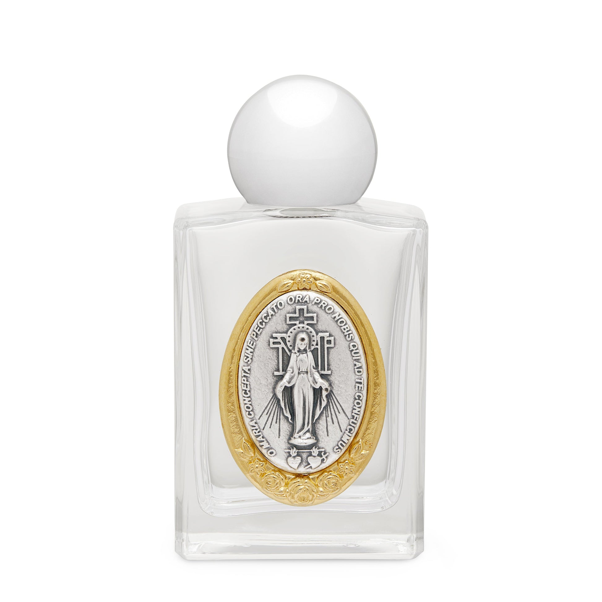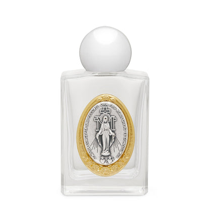 Bottiglietta di 50 ml per Acqua benedetta raffigurante La Vergine Miracolosa. Dimensioni della bottiglietta: 8 x 4 cm.