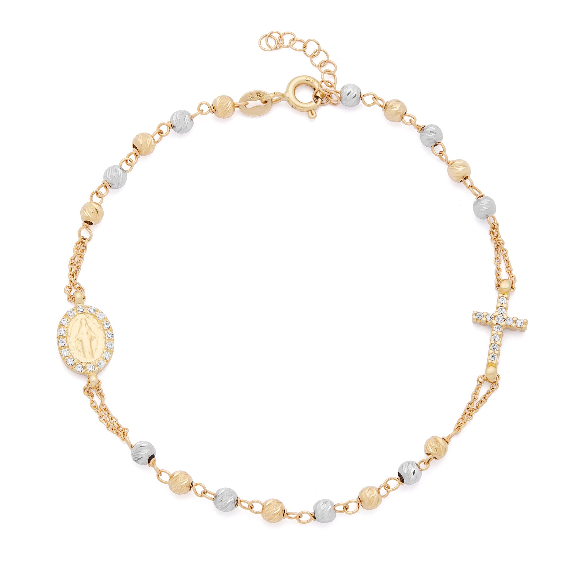 Bracciale con Grani Piccoli Sfaccettati in Oro Giallo e Oro Bianco con Medaglia Miracolosa e Croce con Zirconi