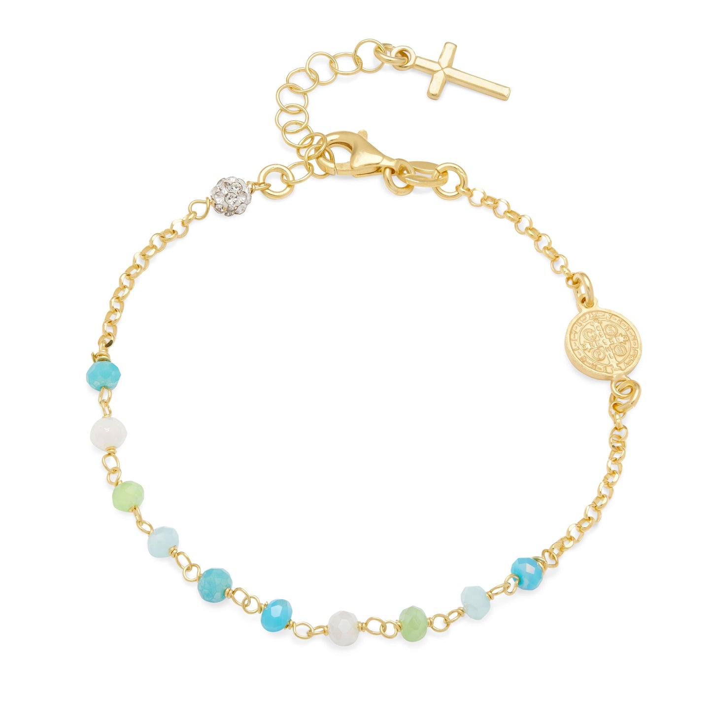 Bracciale in Argento Placcato Oro Con Grani Azzurri E Medaglia Di San Benedetto