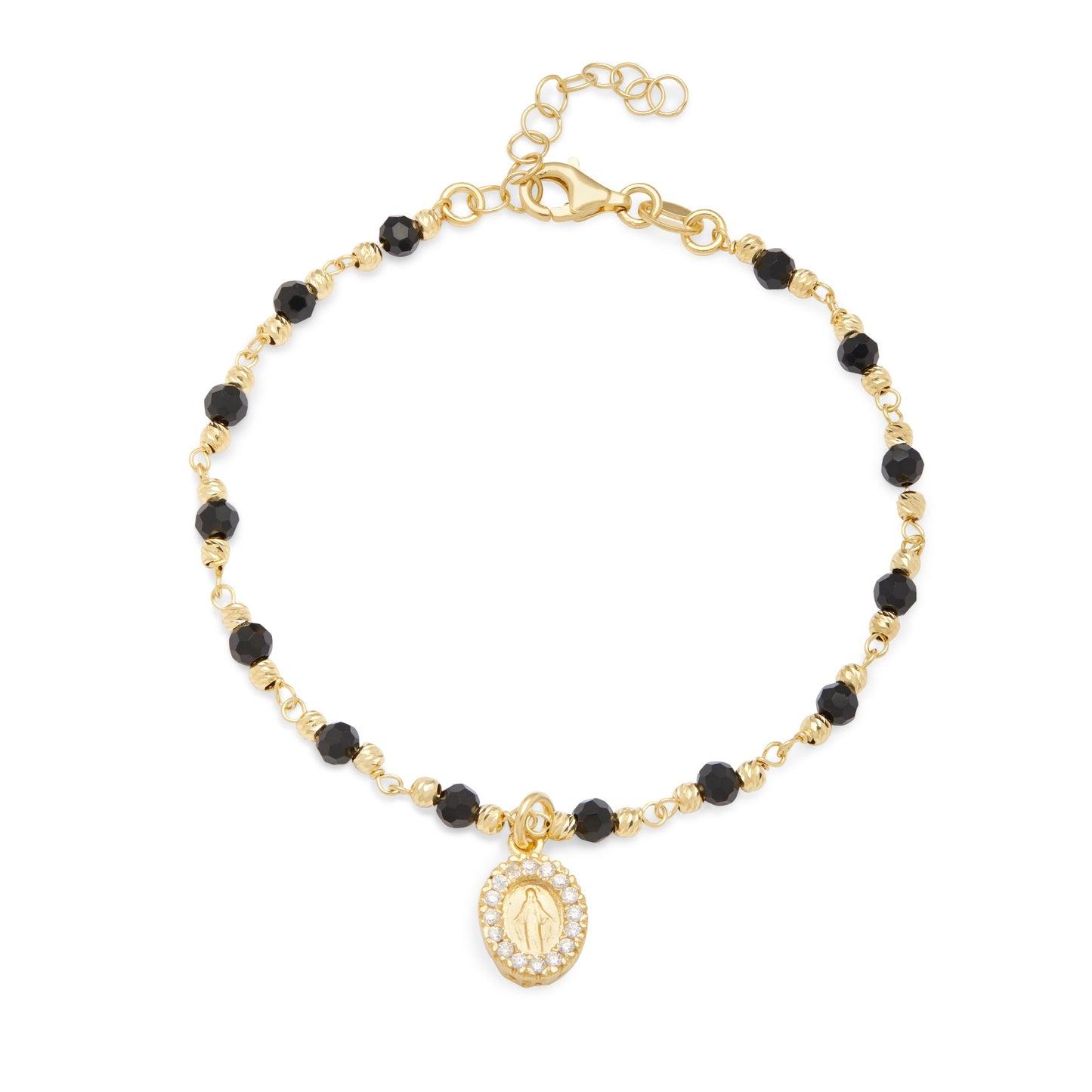 Bracciale in Argento Placcato Oro Con Grani Neri E Medaglia Miracolosa Con Zirconi Pendente