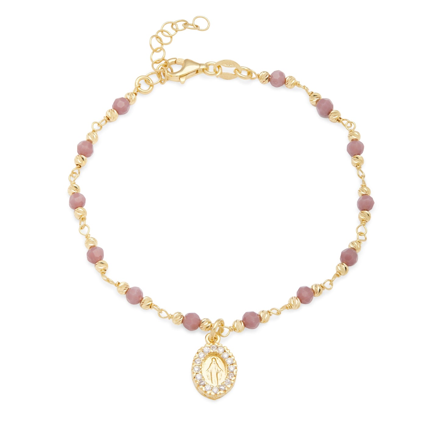 Bracciale in Argento Placcato Oro Con Grani Rosa E Medaglia Miracolosa Con Zirconi Pendente