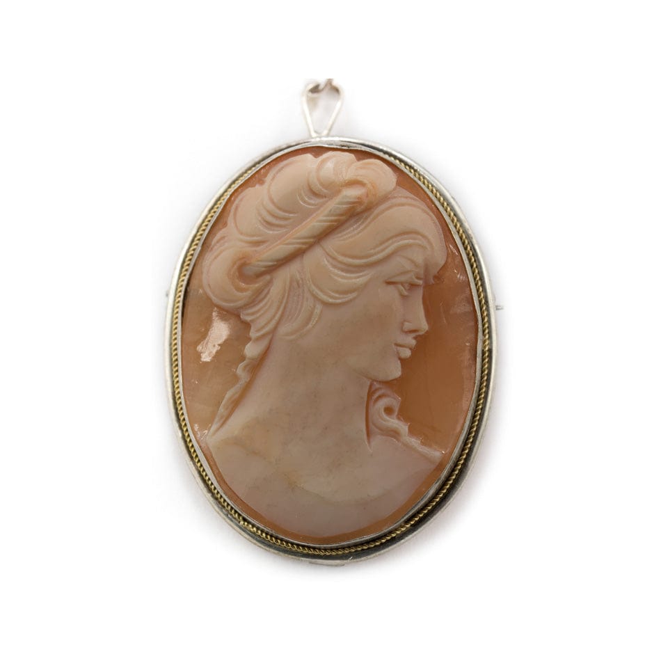 Cammeo a ciondolo e spilla raffigurante il classico profilo di donna realizzato in conchiglia sardonica e con montatura in argento.