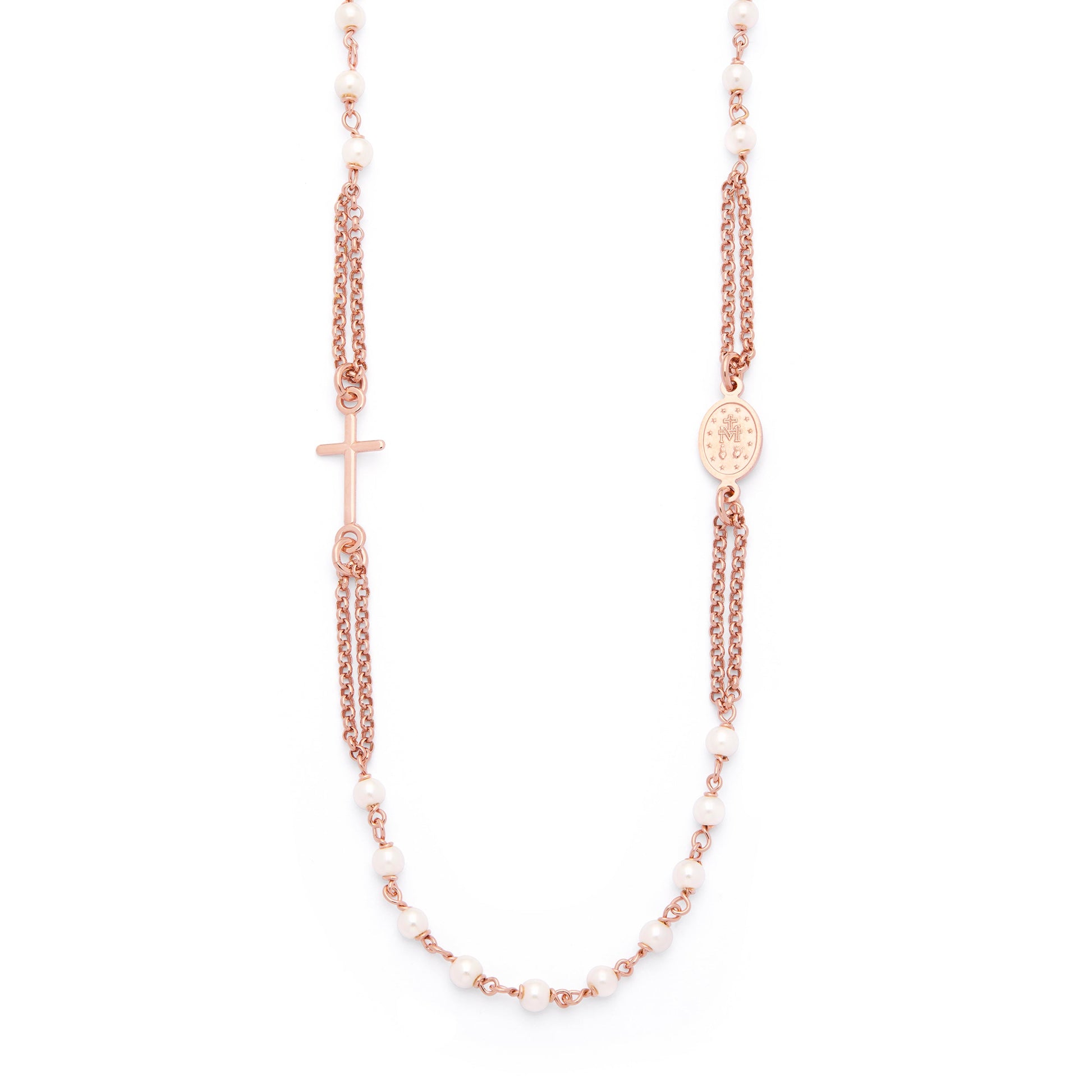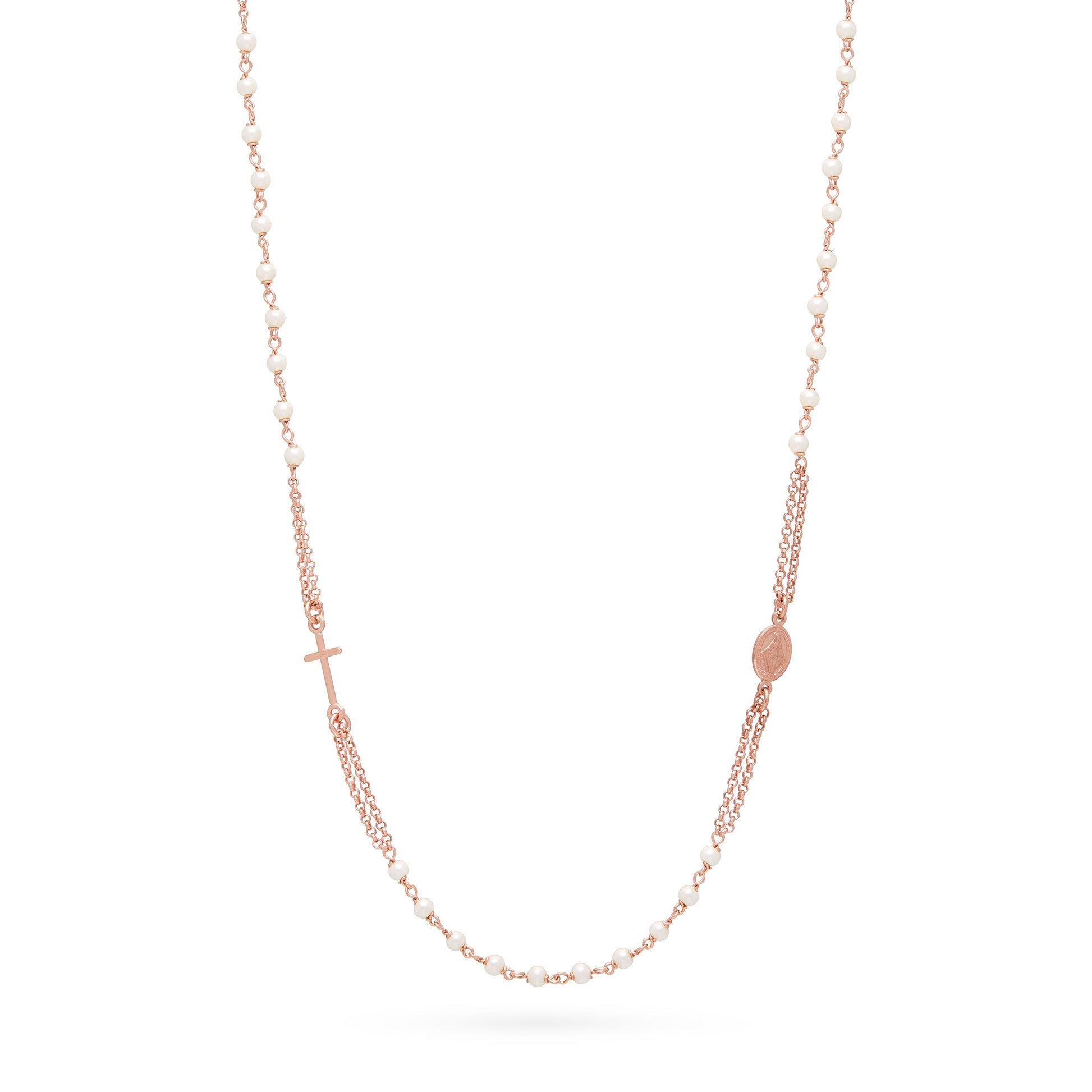 Collana Rosario Doppio Filo in Argento Placcato Oro Rosa con Grani in Perla Sintetica