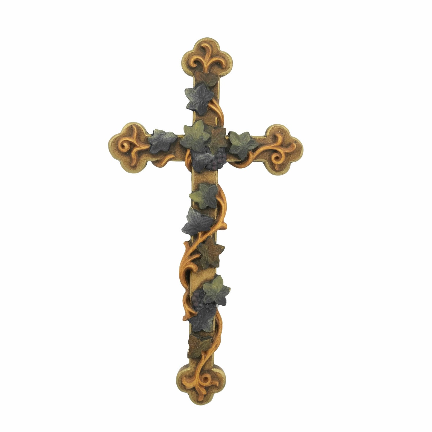 Croce da Parete realizzata in Legno dipinta interamente a mano con Uva e Tralci di vite. La seguente frase è stata tramandata da Gesù ai suoi discepoli: "Io sono la vite, voi siete i tralci". (Gv 15,1) La vite rappresenta un simbolo del legame tra i credenti e Gesù. Gesù come la vite dà loro forza se rimangono legati a Lui e la fede può portare frutto (tralci).