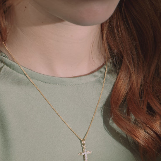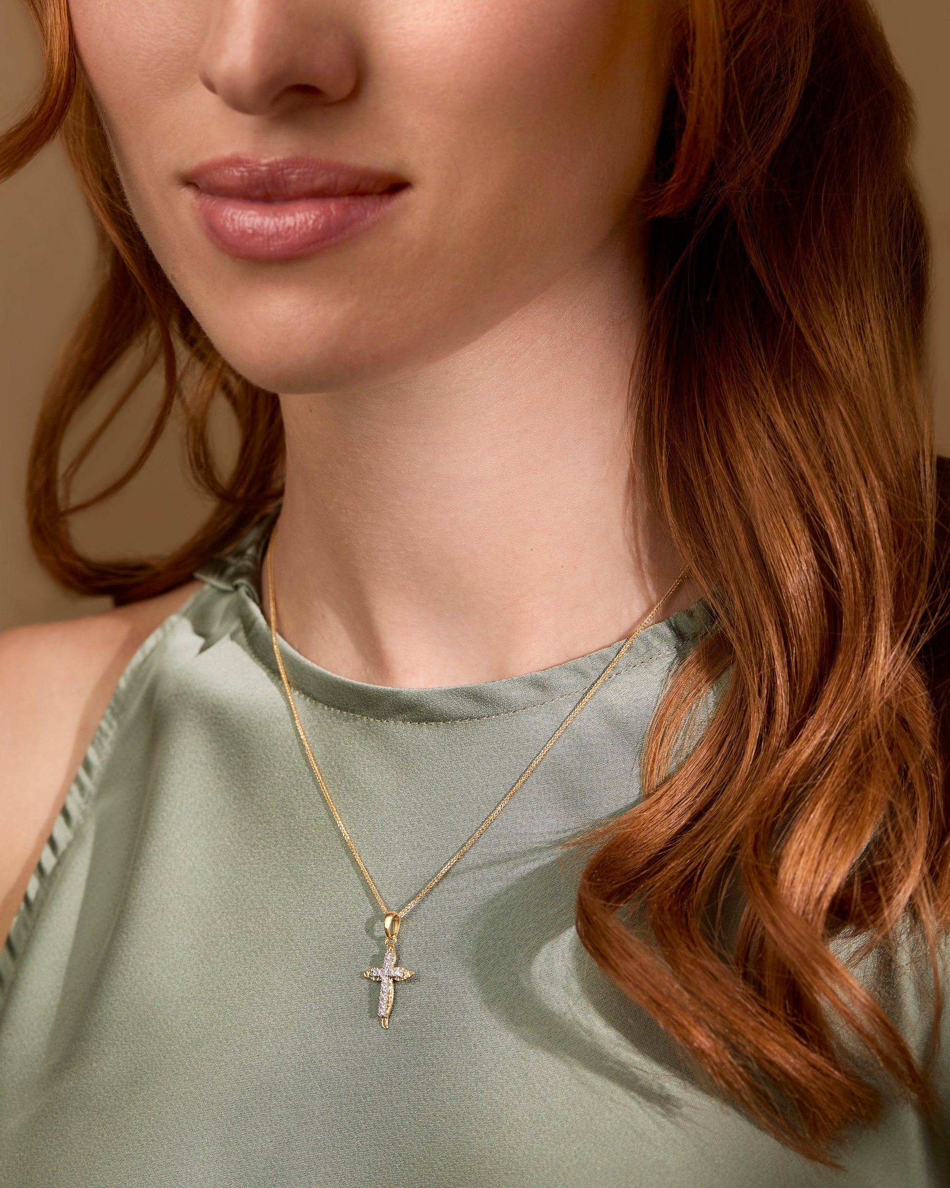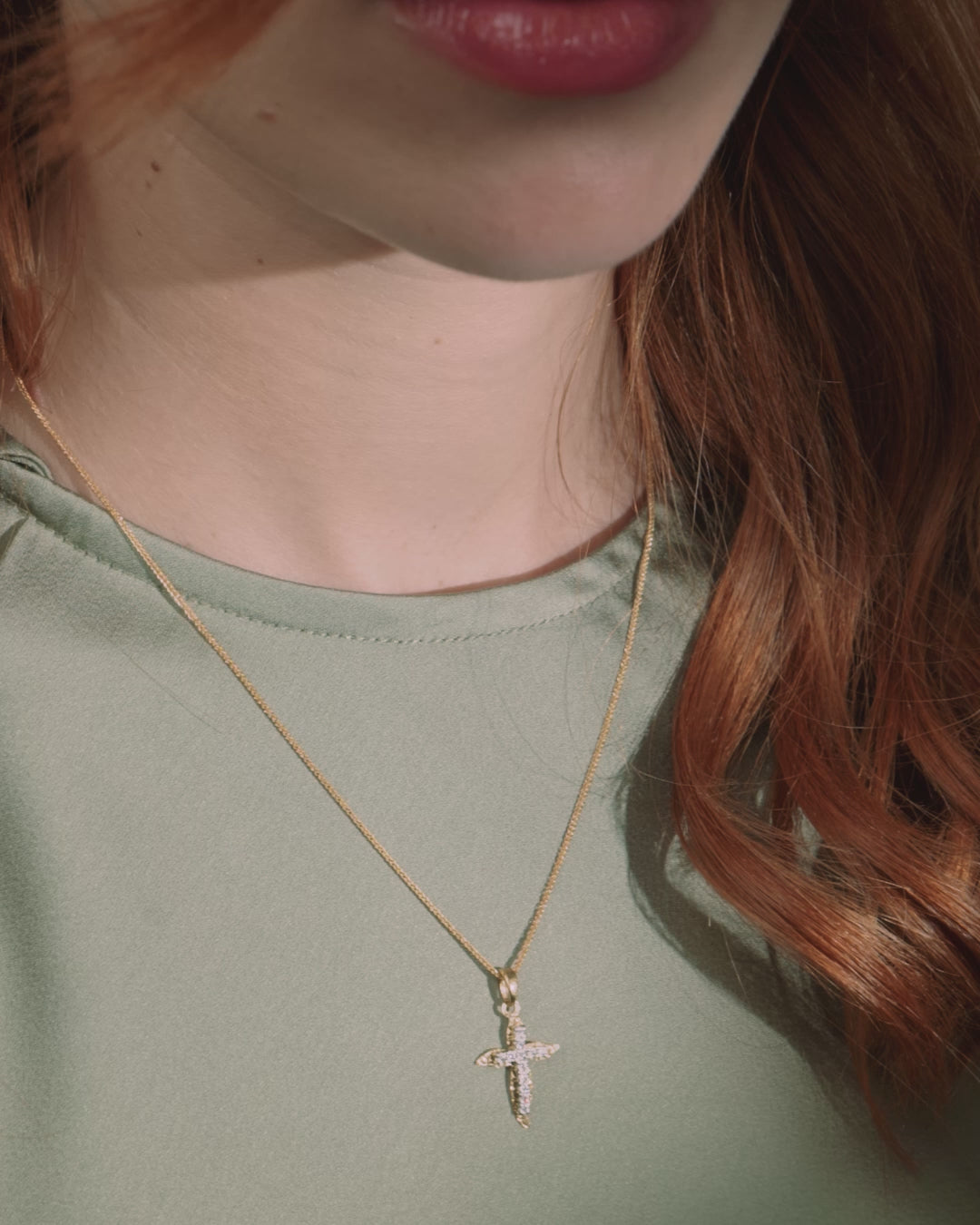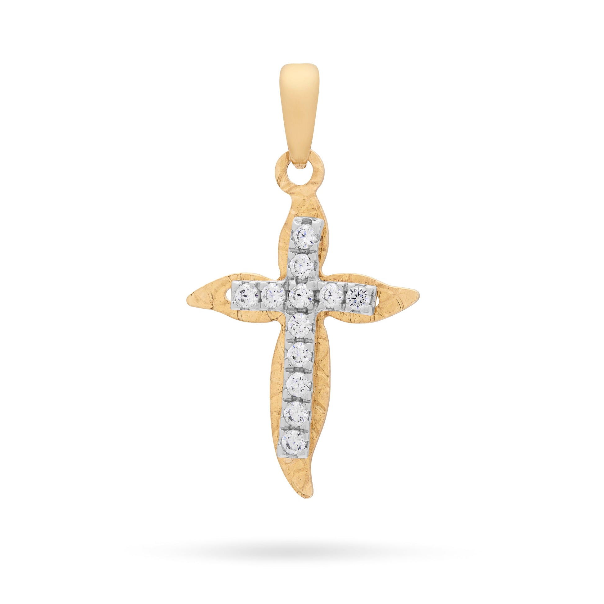 Croce Ondulata Pendente in Oro Giallo Con Centro in Oro Bianco E Zirconi