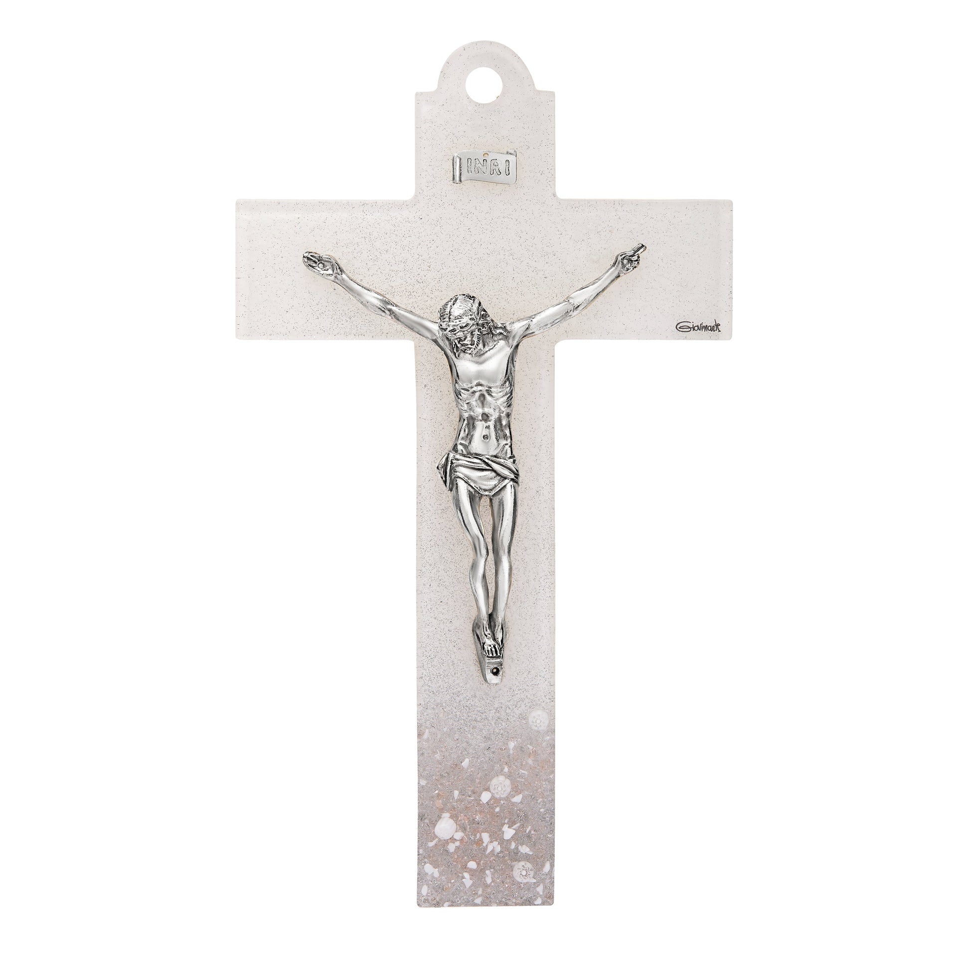 Croce da Parete realizzata in Vetro Murano, corpo in Resina Argentata. Particolari decorazioni floreali e Murrine sono presenti nella parte finale della Croce stessa. Prodotto artigianale fabbricato esclusivamente in Italia.