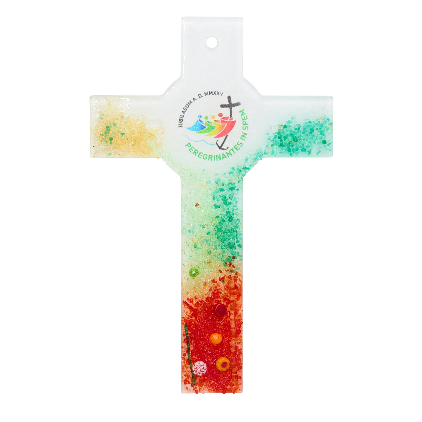 Al centro della croce è presente il logo ufficiale e colorato del Giubileo 2025, simbolo del cammino dei pellegrini e del messaggio universale di unità e misericordia. La forma armoniosa della croce la rende ideale per spazi sacri e come ricordo spirituale di questa celebrazione speciale.