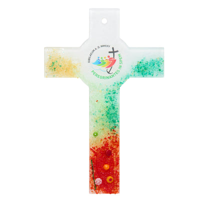 Questa croce da parete in vetro di Murano è stata realizzata per commemorare il Giubileo 2025. Il suo design elegante e ricco di significato presenta una base in vetro bianco arricchita da delicate sfumature verdi, rosse e dorate, che richiamano la fede, la speranza e la luce dello Spirito.