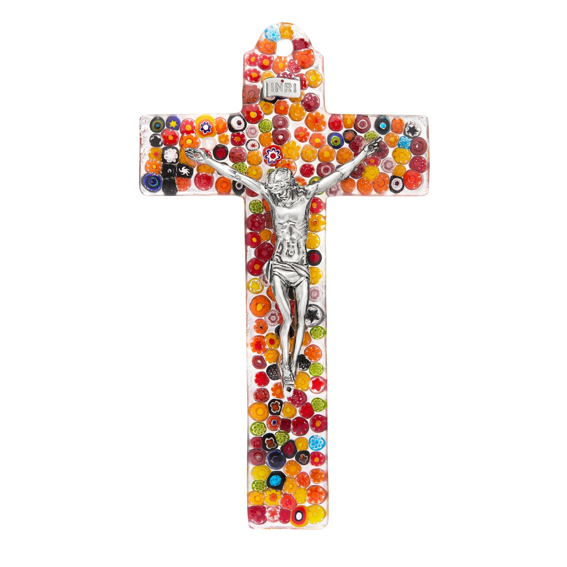 Le origini della lavorazione del vetro a Venezia risalgono ai tempi dell'Impero Romano, quando la società iniziò a produrre e utilizzare oggetti in vetro a livello domestico, religioso e decorativo. La nostra preziosa Croce è realizzata in Vetro di Murano decorata con Murrine stile Millefiori. Il corpo di Cristo è ideato in Resina Argentata.