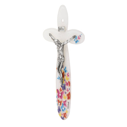 Le origini della lavorazione del vetro a Venezia risalgono ai tempi dell'Impero Romano, quando la società iniziò a produrre e utilizzare oggetti in vetro a livello domestico, religioso e decorativo. La nostra preziosa Croce è realizzata in Vetro di Murano decorata con Murrine stile Millefiori. Il corpo di Cristo è ideato in Resina Argentata. La nostra preziosa Croce a Fiocco è realizzata in Vetro Murano con curiose farfalle presenti nella parte finale della Croce stessa.