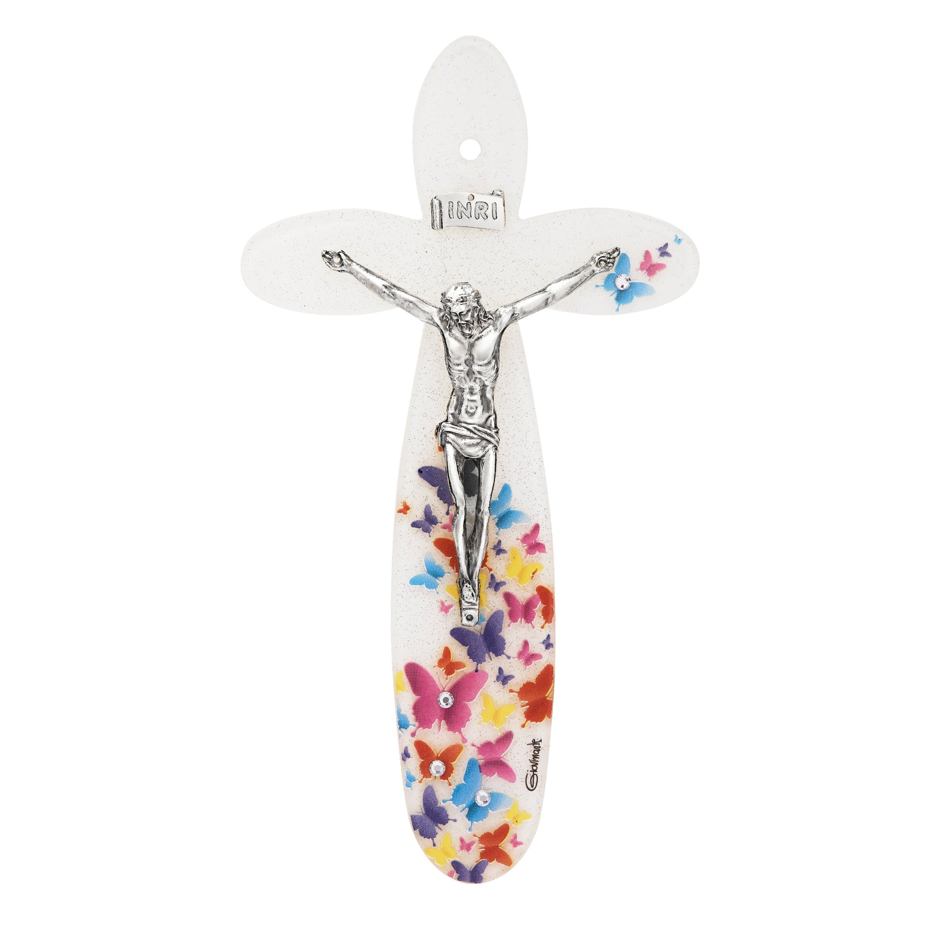 Crocifisso Stondato in Vetro Di Murano Con Farfalle