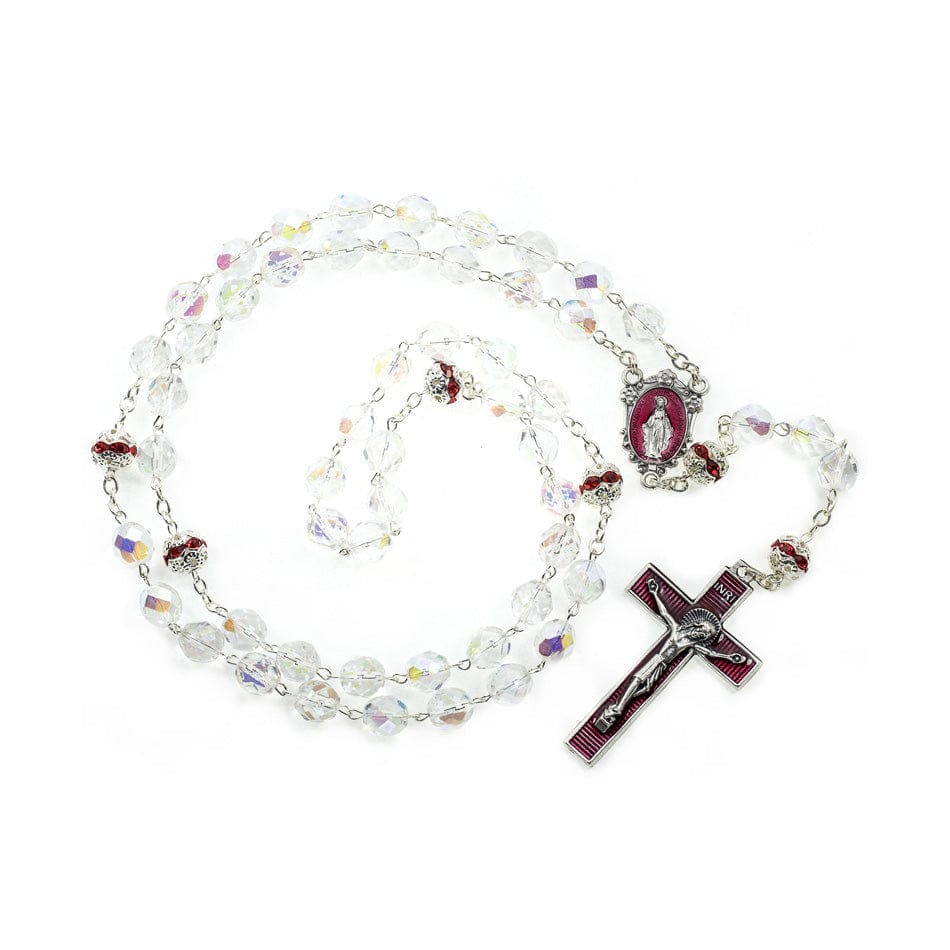 Rosario composto da grani in cristallo con ghiere swarovski, crociera smaltata con la Miracolosa, croce smaltata.