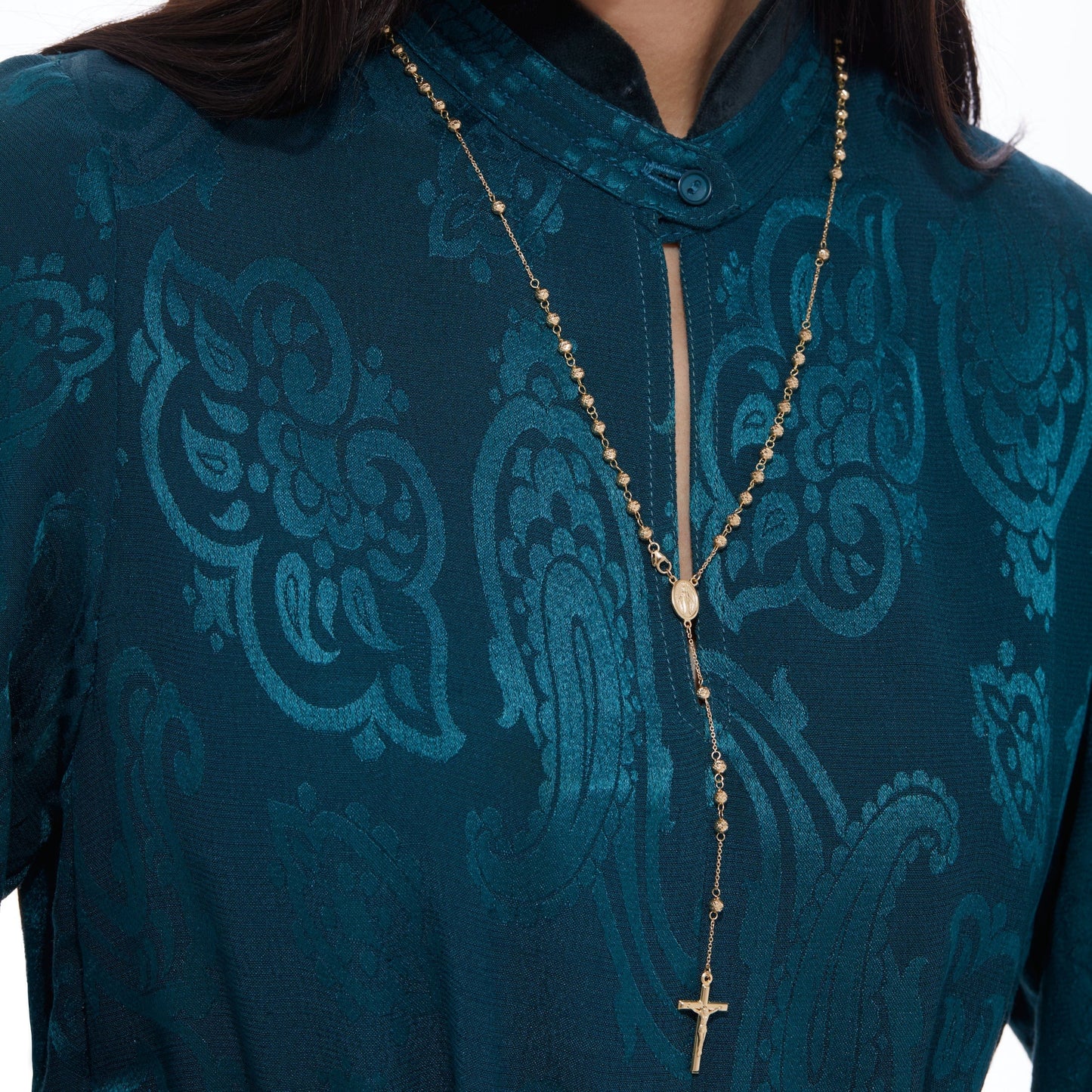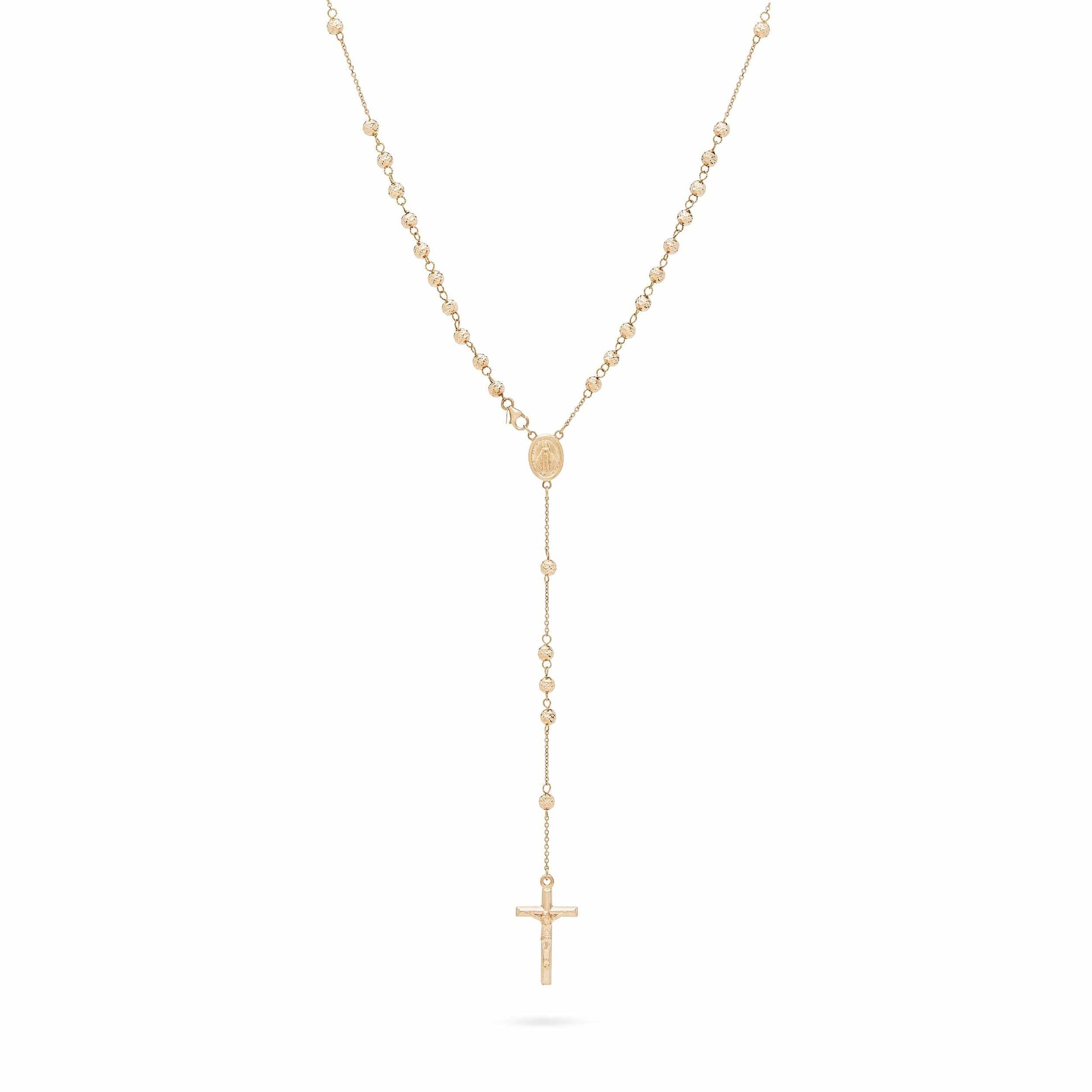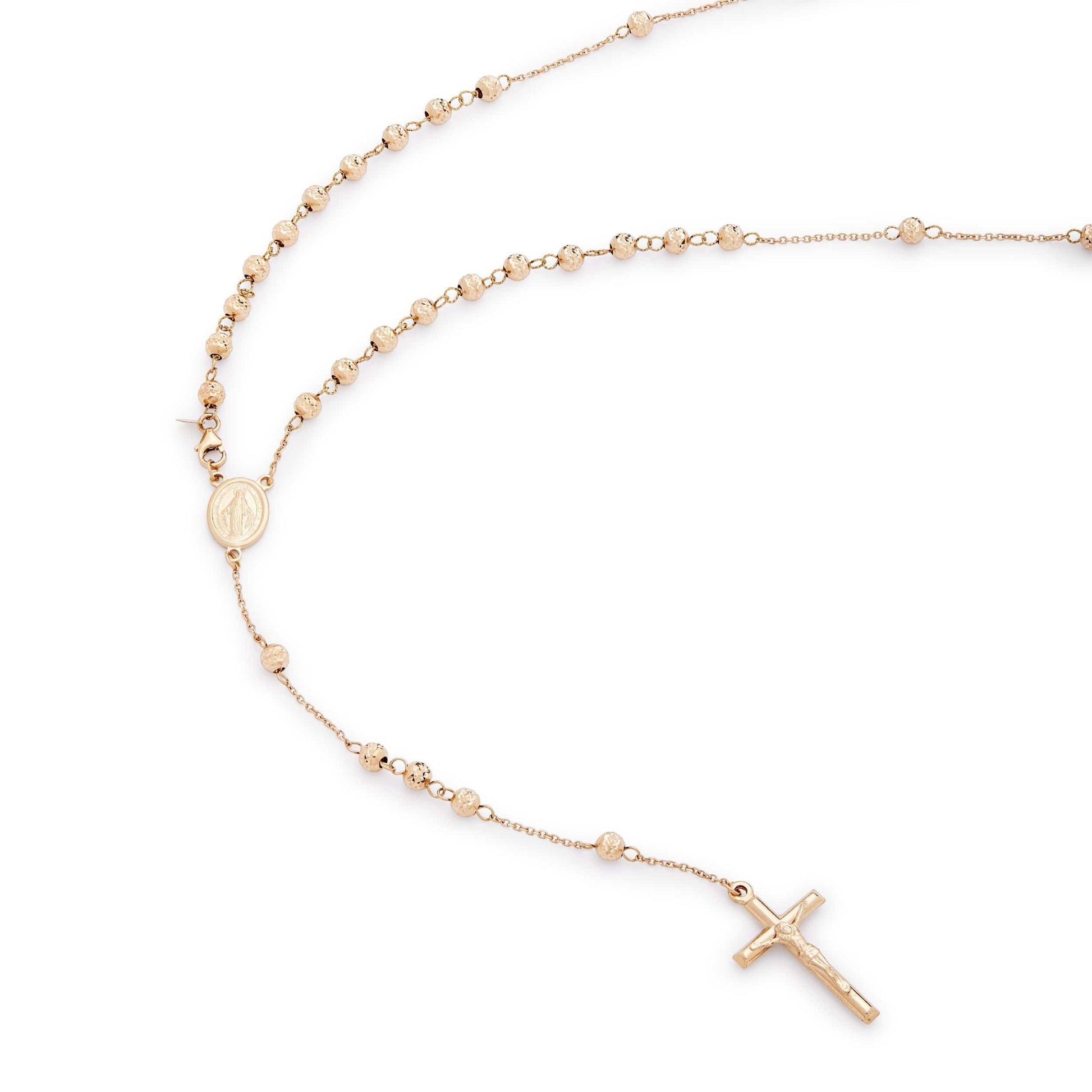 Rosario a cinque decadi in oro giallo 18 carati con grani sfaccettati di 4 millimetri. Medaglia raffigurante Maria Miracolosa e crocifisso.