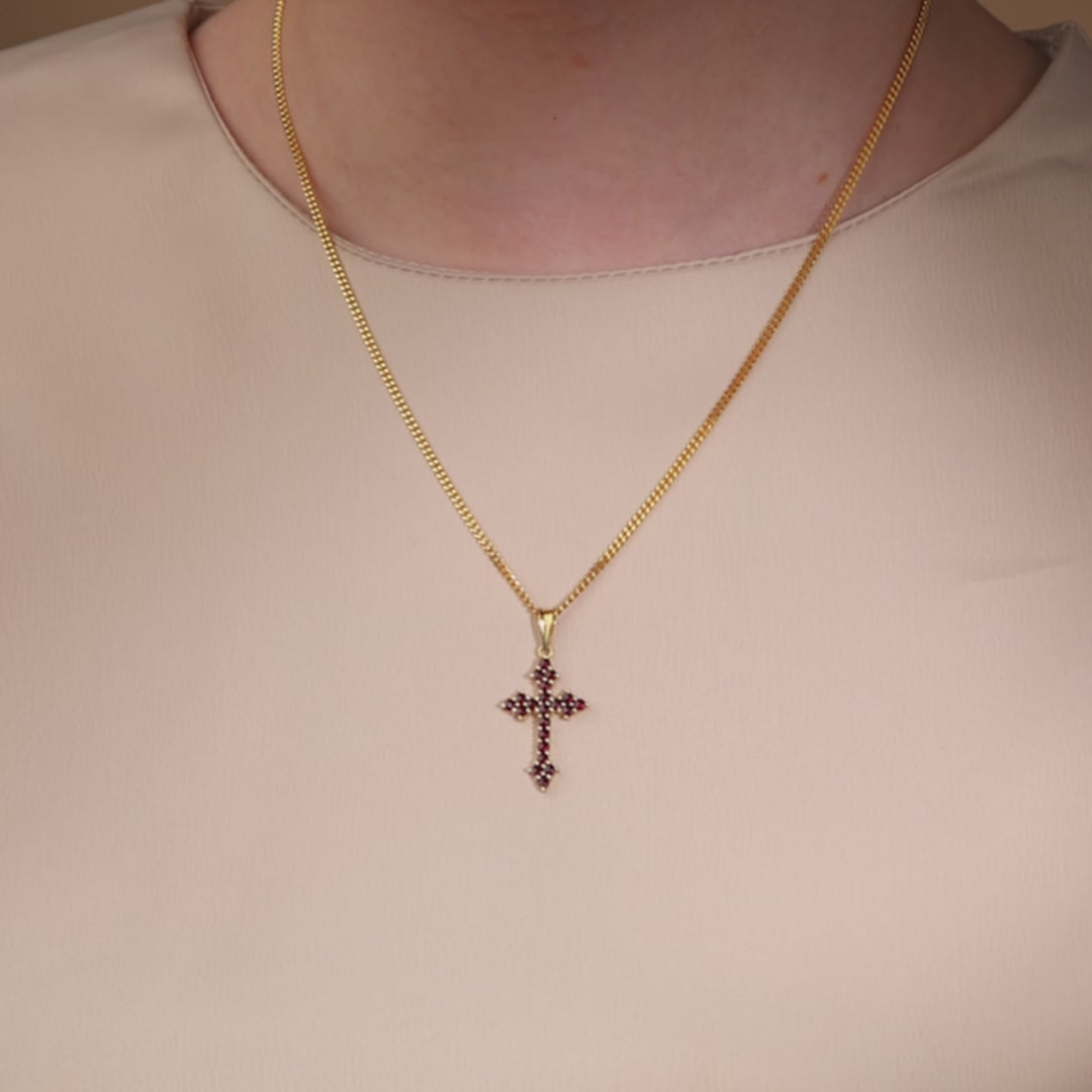 Croce Trifogliata senza Corpo in Pietra Granata lavorata in Argento 925 placcata in Oro 18kt.