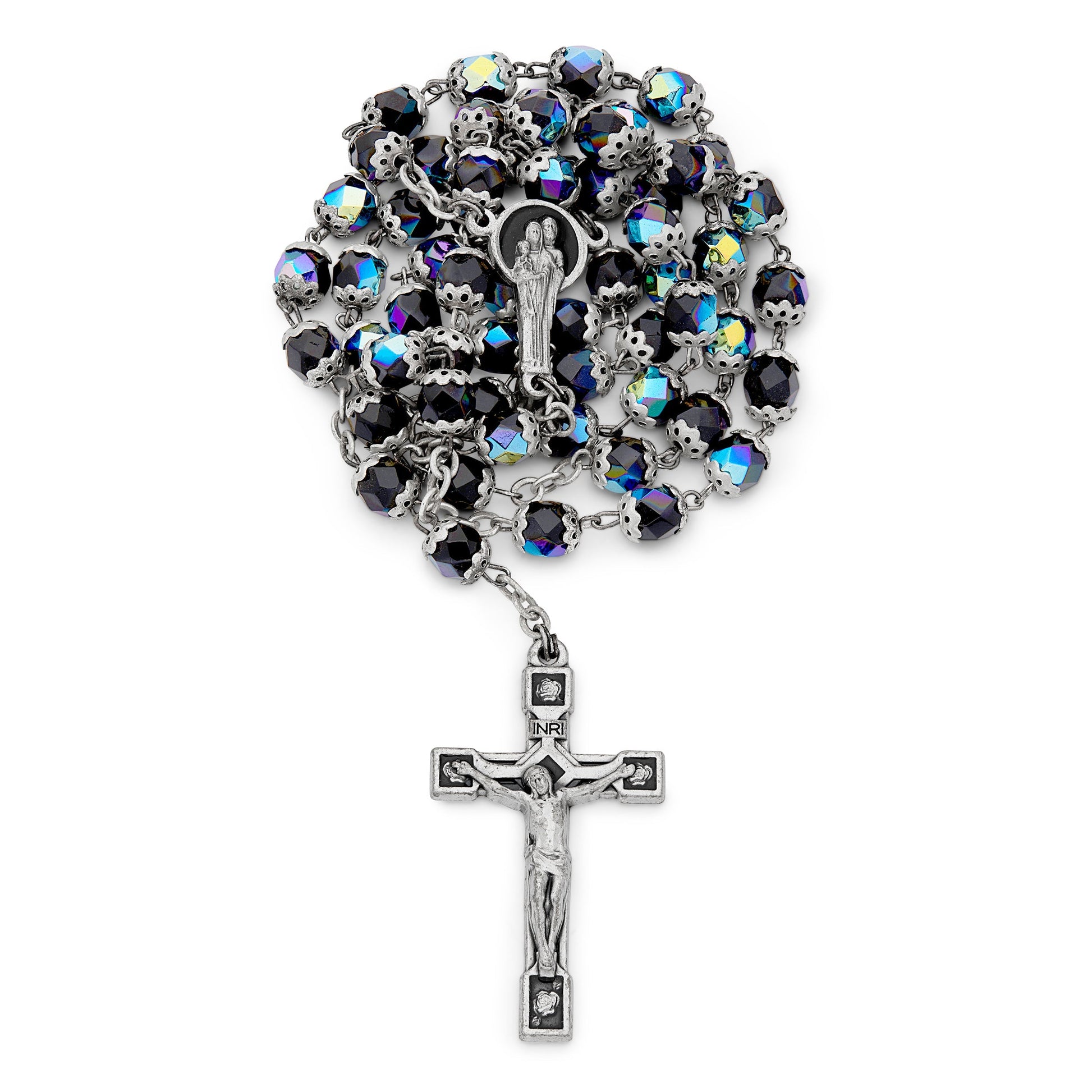 Rosario formato da grani in cristallo sfaccettato di color nero, incapsulati da coppette in filigrana, crociera smaltata raffigurante la Santa Famiglia, crocifisso smaltato.