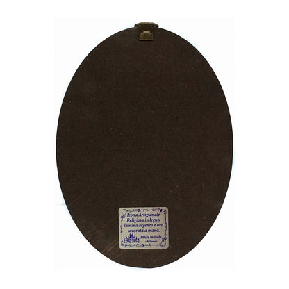 Icona ovale raffigurante lo Spirito Santo stilizzato in lamina d'argento su base di legno.