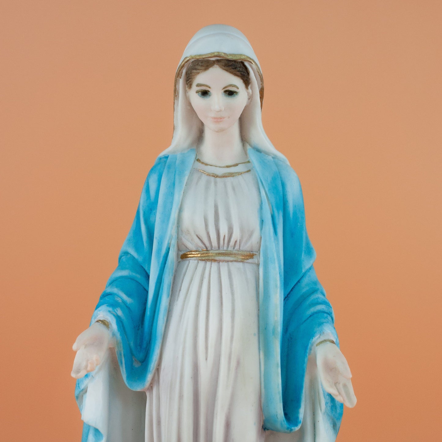 Bellissima riproduzione della Vergine Miracolosa realizzata in polvere di marmo, decorata e finita completamente a mano secondo la tradizione dello stile Capodimonte. La Vergine viene qui rappresentata con le braccia in posizione aperta come simbolo di accoglienza e di indulgenza nei confronti di ognuno di noi. Quelle stesse braccia ci ricordano l'Amore di una Madre pronta ad accogliere tra le sue braccia il ritorno del Figlio allontanatosi.