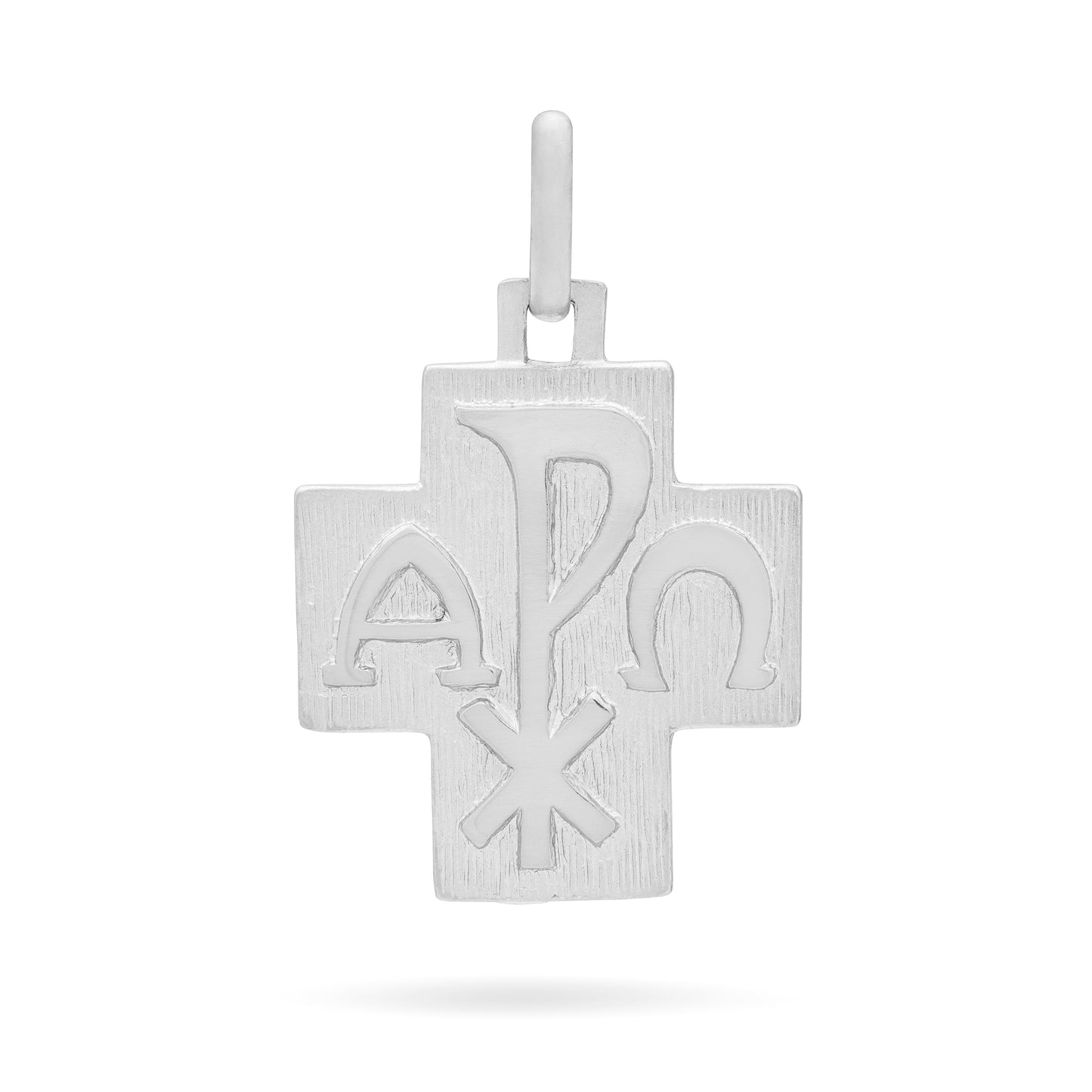 Elevate il vostro stile con l'elegante medaglia Chi Rho a forma di croce in oro bianco con l'iconico monogramma di Cristo e il ritratto di Papa Francesco sul retro. Realizzato in oro bianco di alta qualità, questo ciondolo è l'aggiunta perfetta a qualsiasi collana, aggiungendo un tocco di raffinatezza e spiritualità al vostro look.
