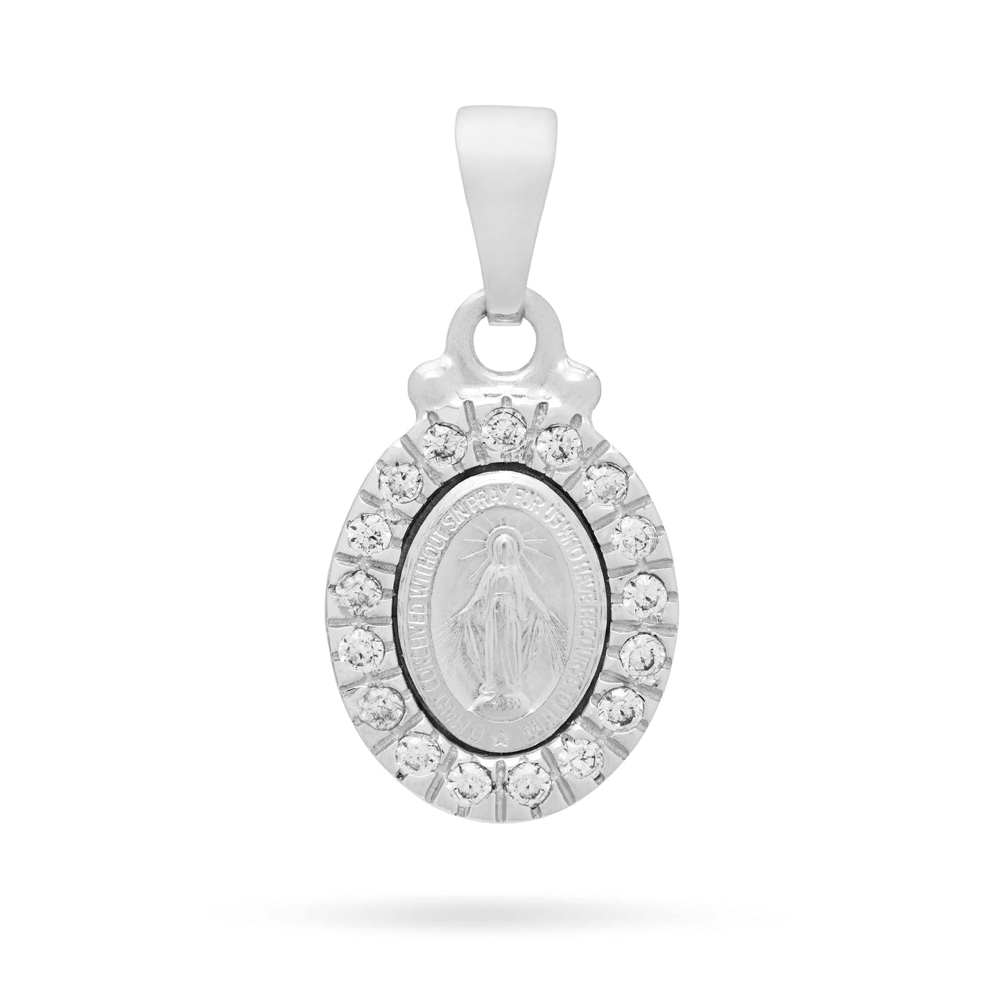 Mini Ciondolo raffigurante la Madonna Miracolosa realizzata in Oro Bianco 18K, contorno caratterizzato da Zirconi Bianchi di alta qualità. Secondo quanto riferito da Suor Labouré, questa medaglia fu coniata come segno di amore, pegno di protezione e sorgente di Grazie.