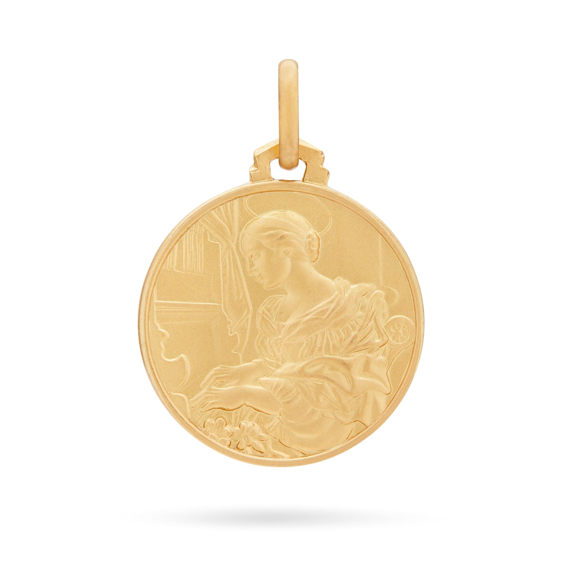 Questa medaglia in argento placcata oro raffigura Santa Cecilia, la patrona dei musicisti. Finemente dettagliata, rappresenta la santa con il suo caratteristico strumento musicale. Indossata come amuleto, offre protezione ai musicisti, ai cantanti e a tutti coloro che operano nel campo della musica, fornendo loro ispirazione e salvaguardia nelle loro attività artistiche.
