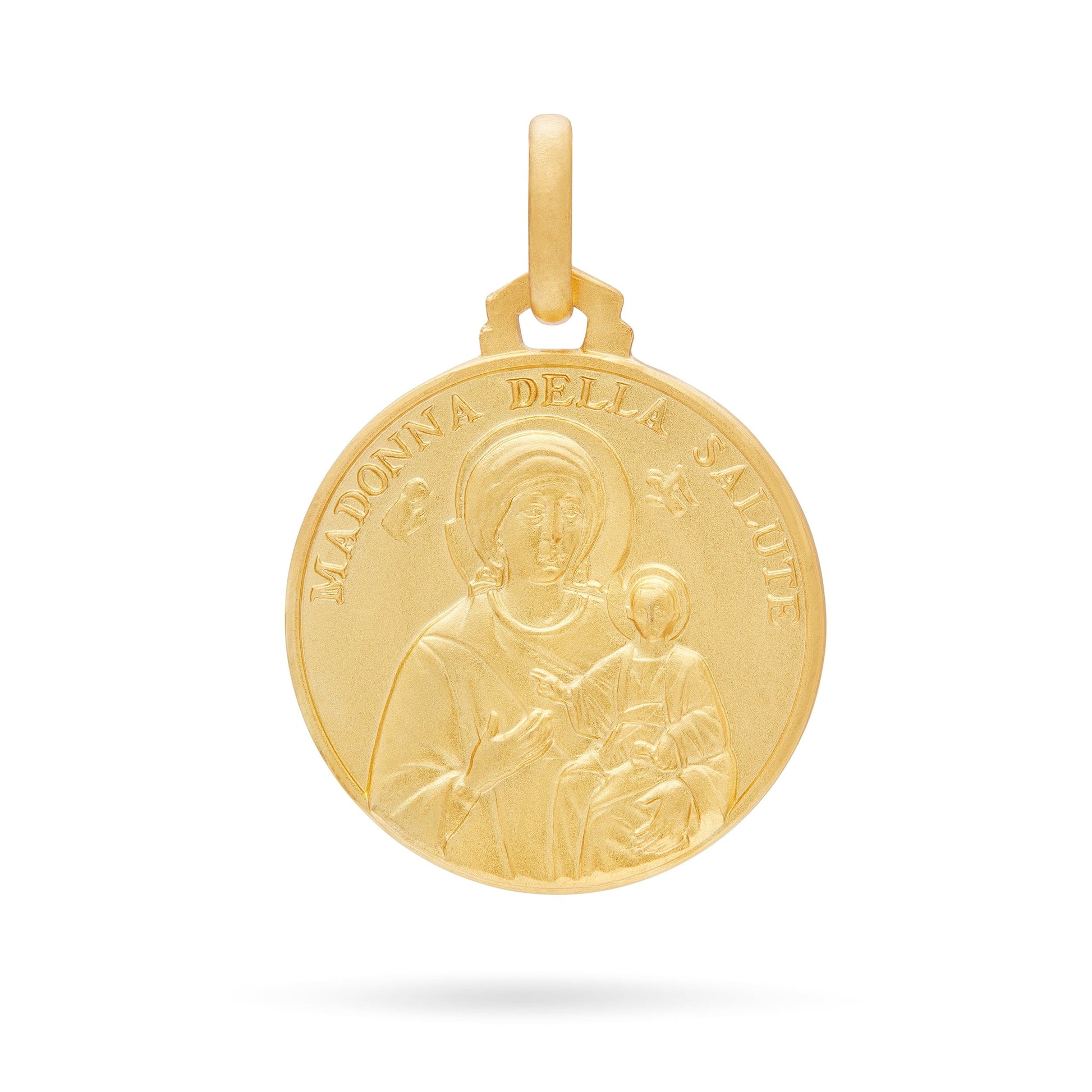 La Medaglia in oro giallo della Madonna della Salute è un'icona religiosa che raffigura la Madonna della Salute, figura venerata nella tradizione cattolica come protettrice della salute e del benessere. Realizzata in prezioso oro giallo, questa medaglia è spesso indossata come simbolo di devozione e protezione spirituale. Presenta l'immagine della Madonna in una posa benevola, che simboleggia speranza e guarigione per coloro che la indossano. Questa medaglia riveste un'importanza significativa per molti credenti e viene spesso regalata in occasioni speciali o nei momenti di bisogno.